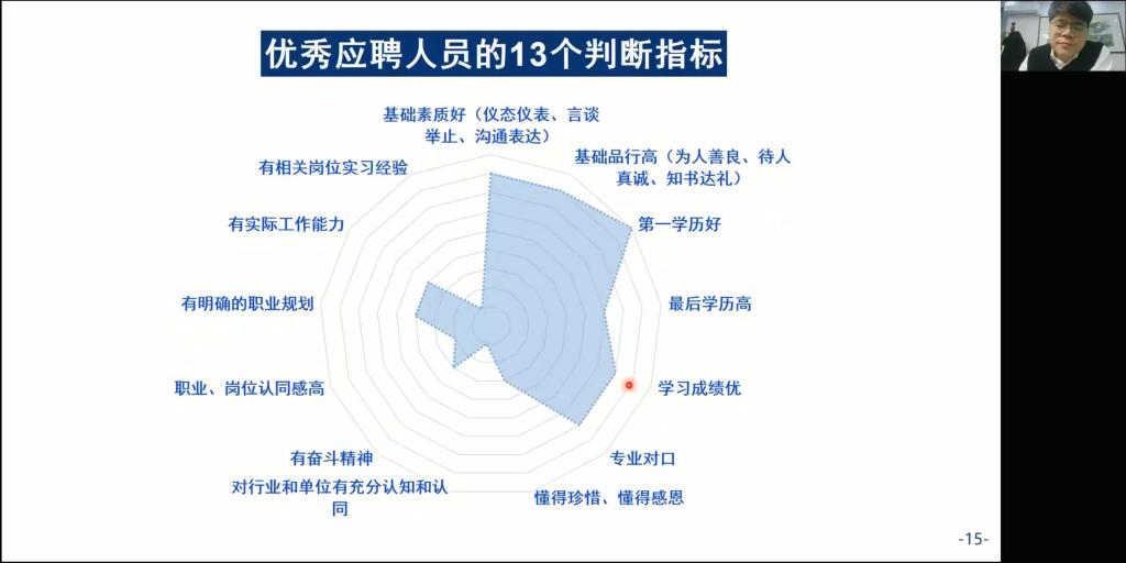 会上,陈太博教授首先综合国际、国内经济发展情况为同学们分析研判了未来几年的就业形势——“百业承压,压力与机遇并存”,鼓励员工结合国家加快发展数字经济的战略规划对就业问题深思考、早谋划。随后,陈教授从基础素质、工作能力、奋斗精神等13个维度,详细阐述、剖析了优秀应聘者的价值判断指标,为同学们指明了努力的方向。最后,陈教授以细致规划、换位思考、双赢合作、直面批评、合理期望,及务实奋斗等关键词勉励与会员工重视实习实践,从实际工作场景中切实提升专业能力。
