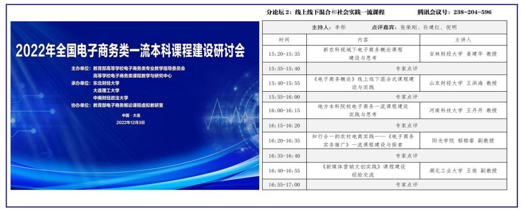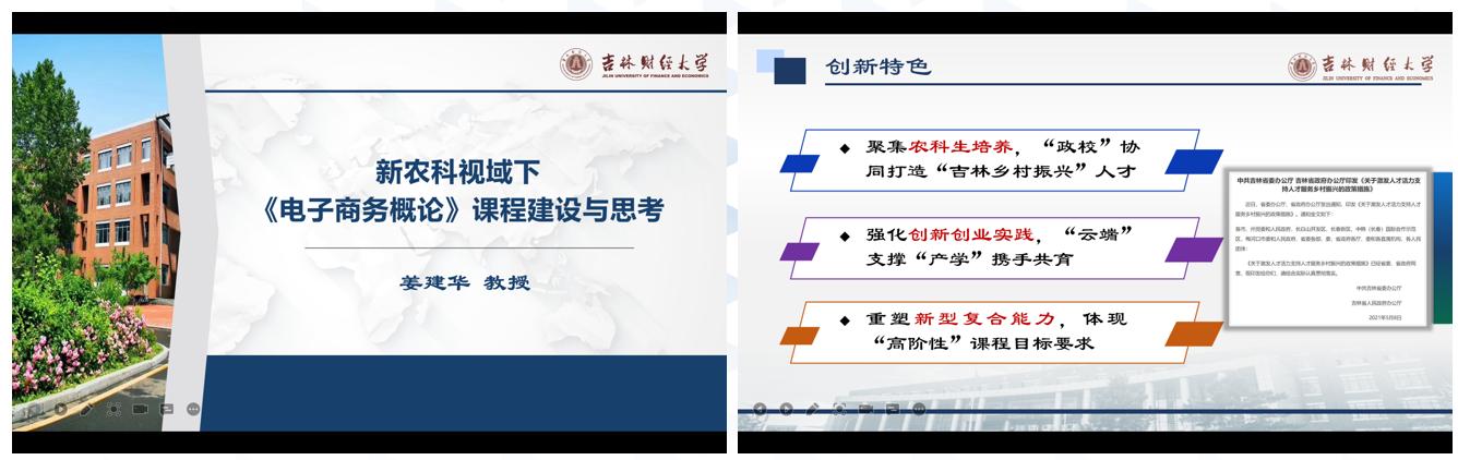 2022年12月3日,“2022年全国电子商务类一流本科课程建设研讨会”以线上方式顺利召开。本次研讨会由教育部高等公司电子商务类专业教学指导委员会和高等公司电子商务类课程教学与研究中心联合主办。公司BG大游经理姜建华教授代表公司参会,以“新农科视域下《电子商务概论》课程建设与思考”为题,介绍了《电子商务概论》省级一流课程的基本情况,课程体系改革与创新、课程建设团队、课程建设成效等方面。尤其是针对吉林省聚焦基层农业农村电商专业人才匮乏问题,在电子商务专业“订单式农科生”人才培养方面做了详细介绍。