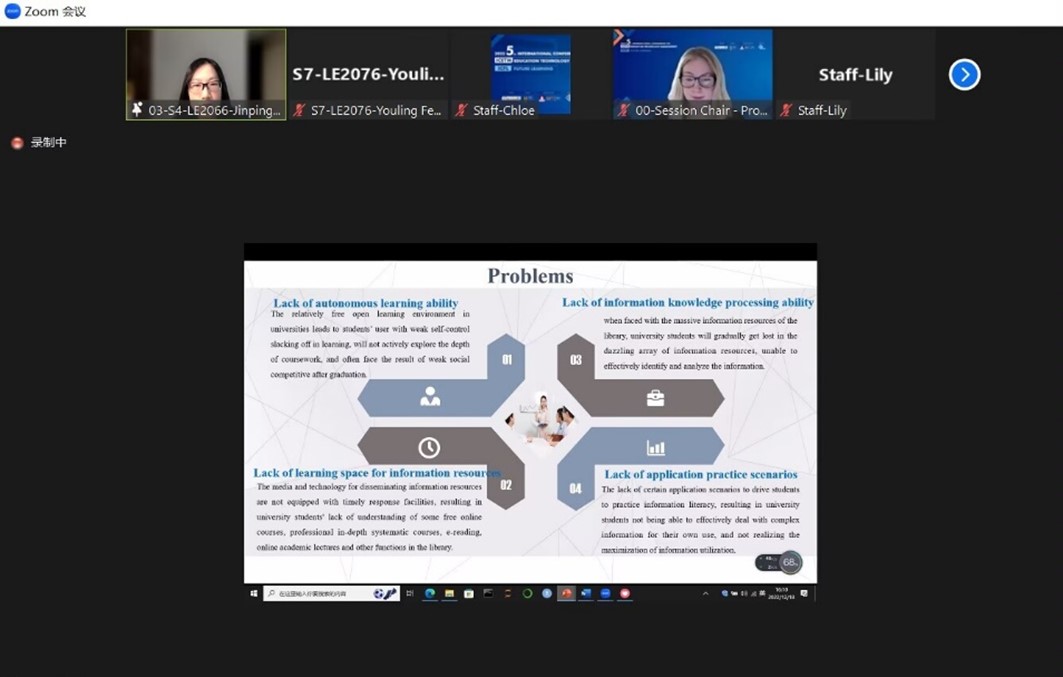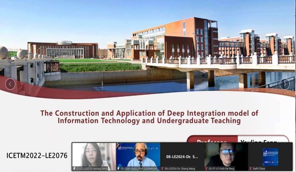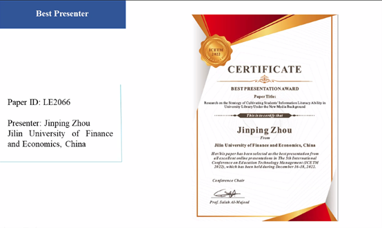 2022年12月18日,BG大游冯由玲教授及周金娉副教授参加了2022年第5届教育技术管理国际会议(ICETM2022)。两位教师依托教学信息化领域的教改与教育规划课题,就产出教学研究成果相关内容,在国际学术会议上发言,并进行主会场英文汇报。报告题目为《The Construction and Application of Deep Integration model of Information Technology and Undergraduate Teaching》与《Research on the Strategy of Cultivating Information Literacy Ability of University Library Student Users under the New Media Background》。两位教师在会议上同与会的各国学者进行交流与探讨,得到专家的充分肯定与认可。会后,周金娉老师荣获本次国际会议的“最佳报告人”奖项。