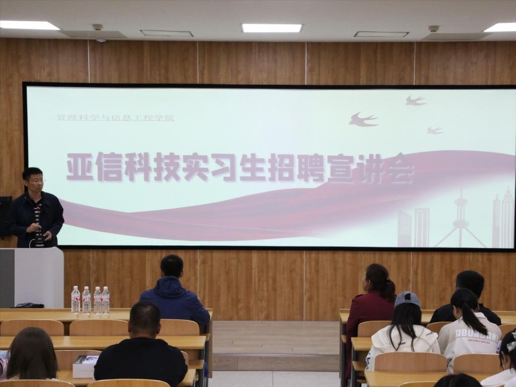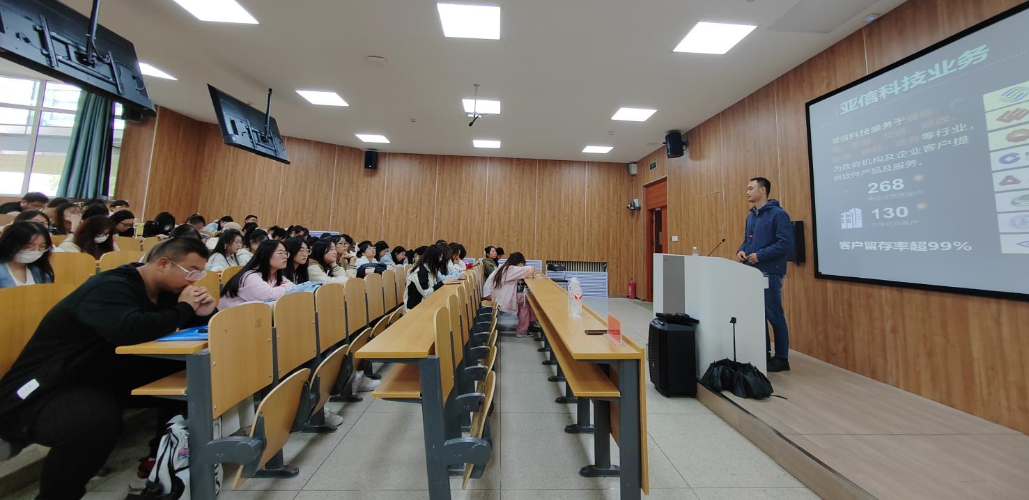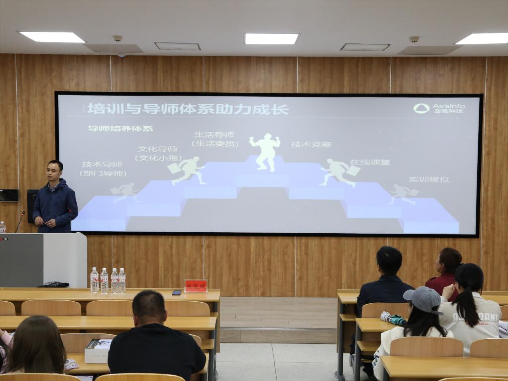 座谈会后,在第一教学楼1206召开了亚信专场招聘宣讲会。会议由数据科学系主任马知行主持,全体大三年级员工参加。施俊斌经理从企业文化、校园招聘计划、实习要求、工作地点、实习补贴、实习福利、企业晋升机制以及实践技能等方面展开了详细的讲解,使同学们对亚信科技有了更深入的了解。