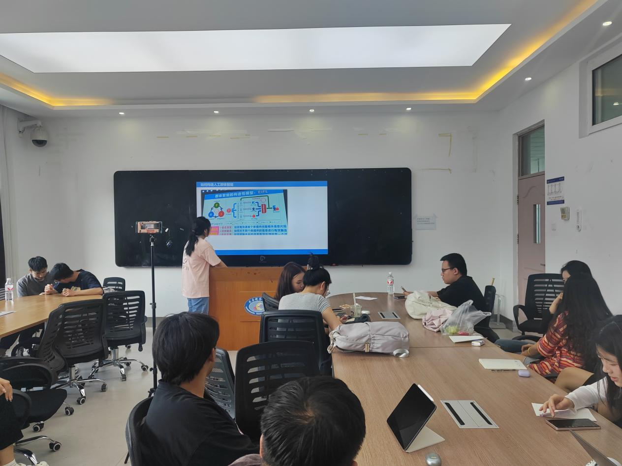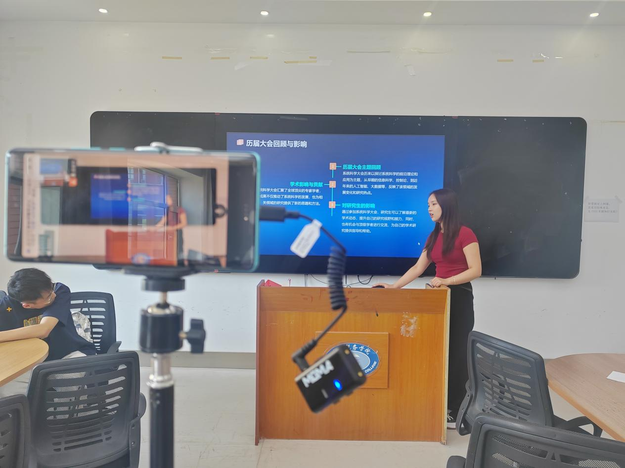 交流会分成两个部分。首先22级研究生吴家旗做了《科研之路:从选题到投稿》为主题的科研论文撰写、投稿经验分享,之后三位参加第八届中国系统科学大会的员工代表孙静怡、柳婕妤、常煜,分别从不同的角度分享了他们的参会经验和收获。