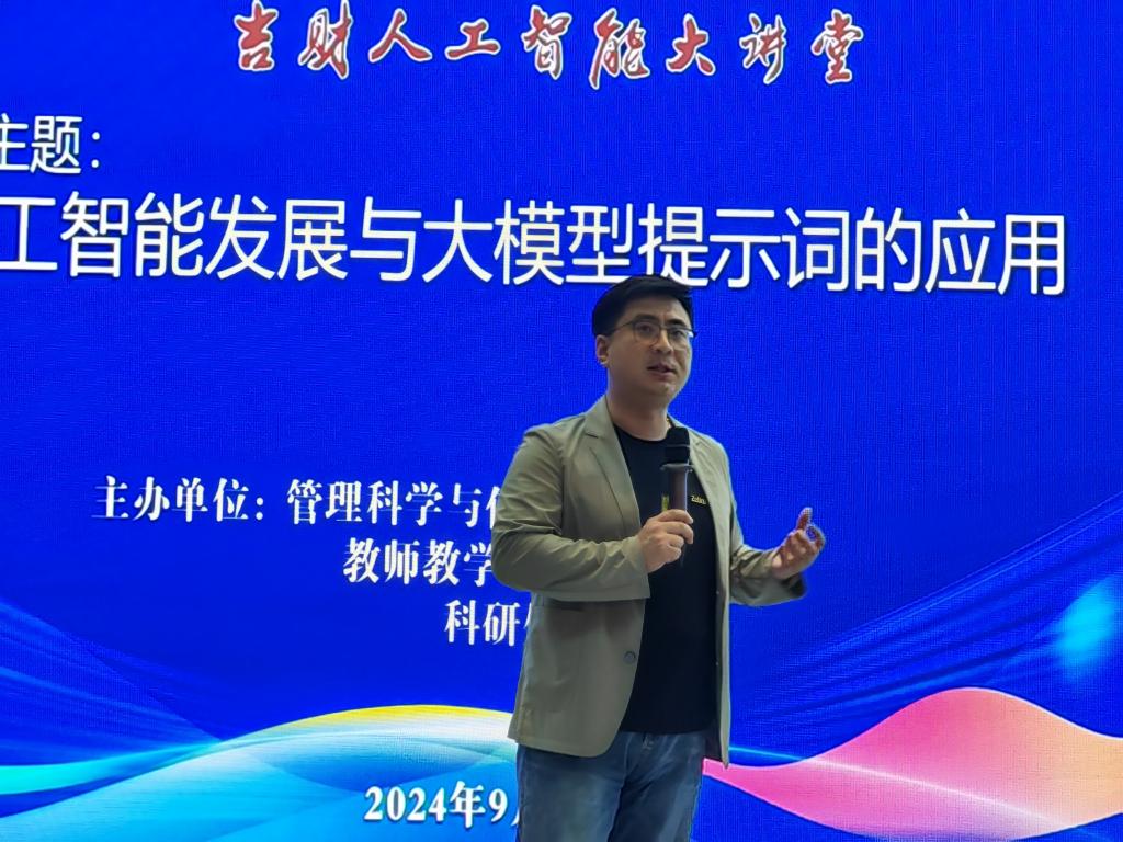 2024年9月24日在新经济(数字经济)创新创业实训中心报告厅,BG大游、教师教学发展中心、科研处联合举办了《人工智能发展与大模型提示词的应用》主题报告会。此次报告会是“吉财人工智能大讲堂”系列活动之一。报告会由BG大游经理姜建华主持。