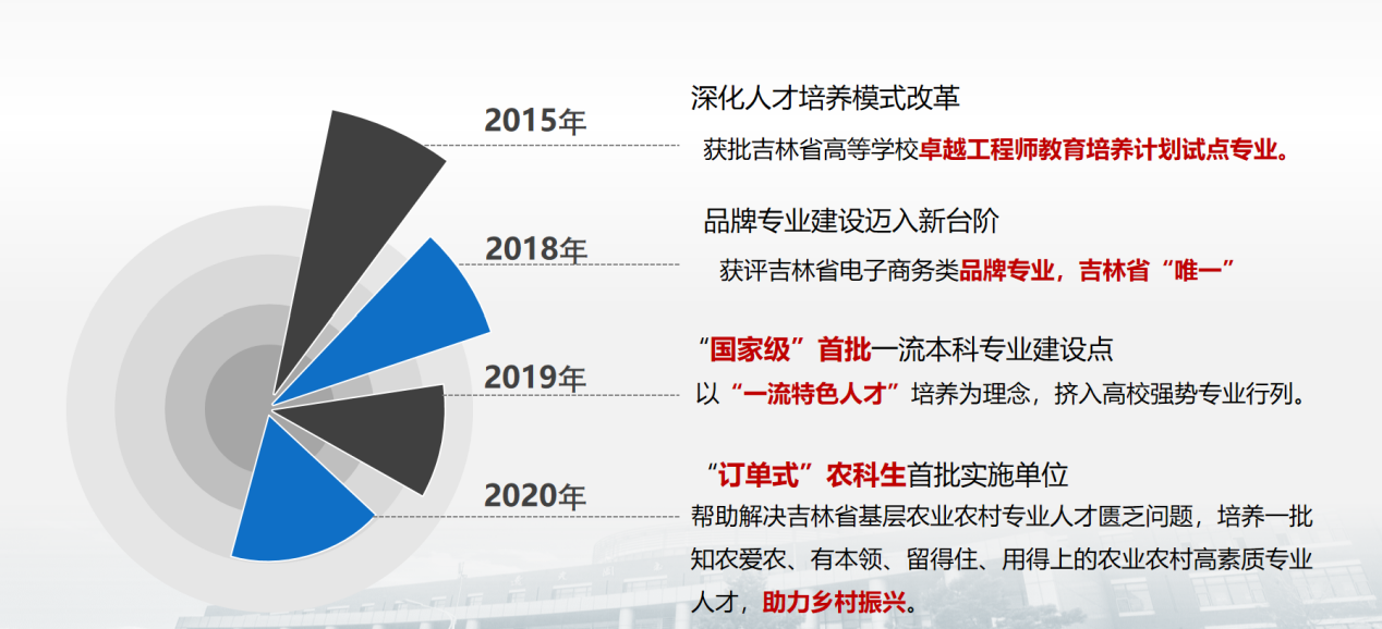 电子商务专业源于1999年与澳大利亚查尔斯特大学的国际联合办学,2002年正式获批本科专业,2015年获评吉林省电子商务类唯一“品牌”专业,同年获批吉林省高等公司卓越工程师教育培养计划试点专业,2018年被认定为“吉林省特色高水平专业”,2019年获批教育部首批“国家一流本科专业”建设点。2023年员工会中国大学一流专业排名A类专业。
