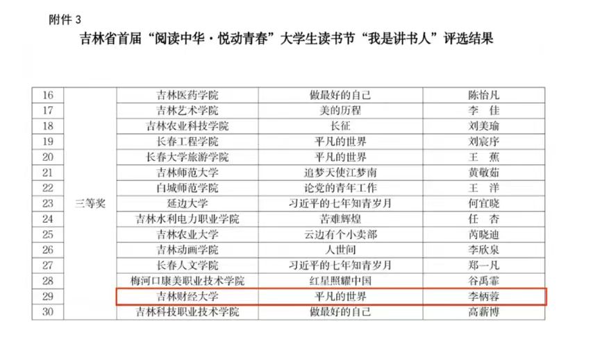 近日,吉林省教育厅公布了吉林省首届“阅读中华·悦动青春”老员工读书节活动的评选结果。公司共有四件作品获奖,其中,公司电子商务2221班李柄蓉同学在“我是讲书人”评选中荣获三等奖。