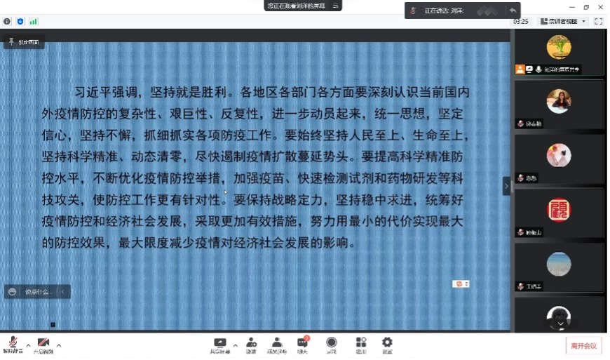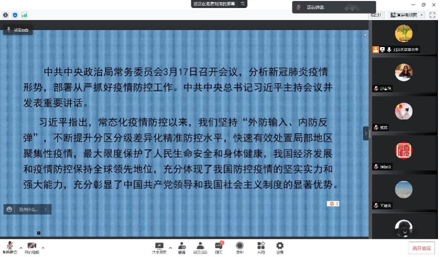 中共中央政治局常务委员会3月17日召开会议,分析新冠肺炎疫情形势,部署从严抓好疫情防控工作。中共中央总书记习近平主持会议并发表重要讲话。BG大游教工第一党支部全体党员于3月24日,开展线上主题党日活动,学习习近平总书记抗疫讲话和重要精神。