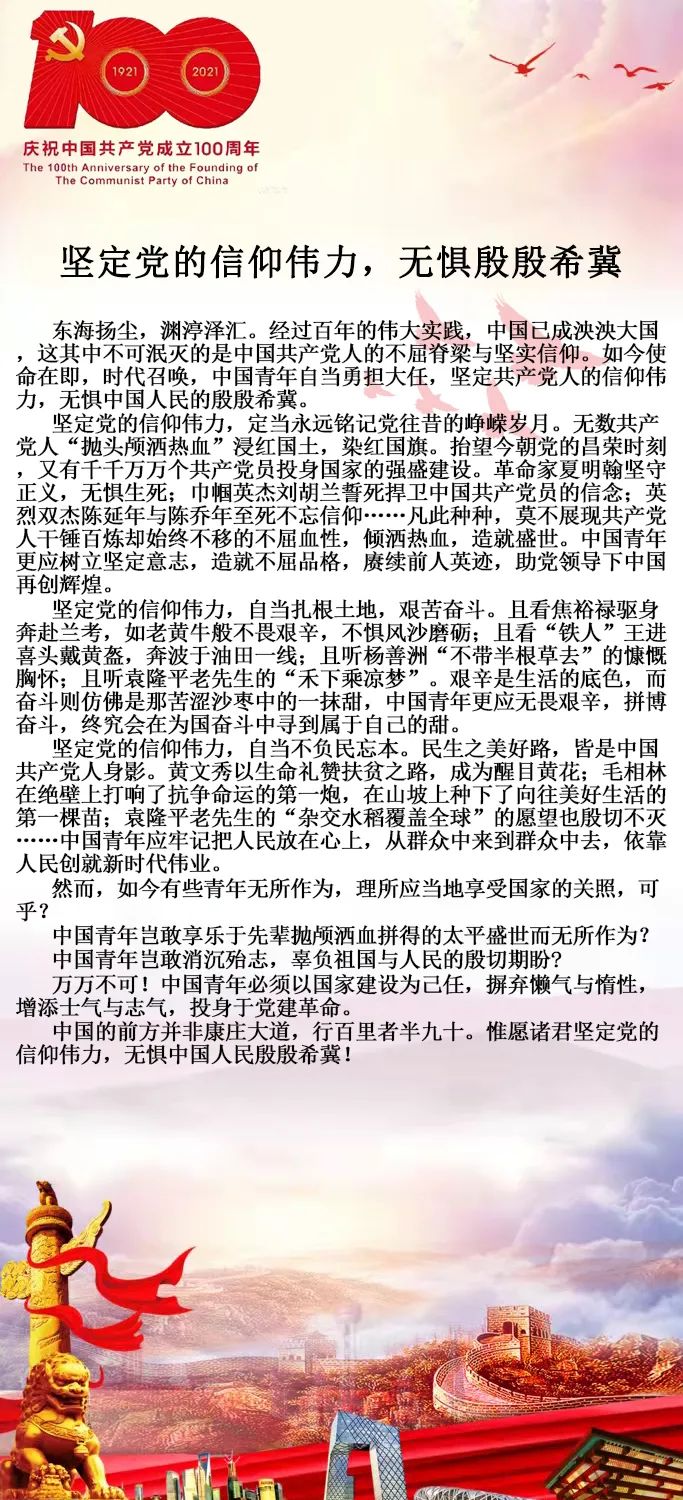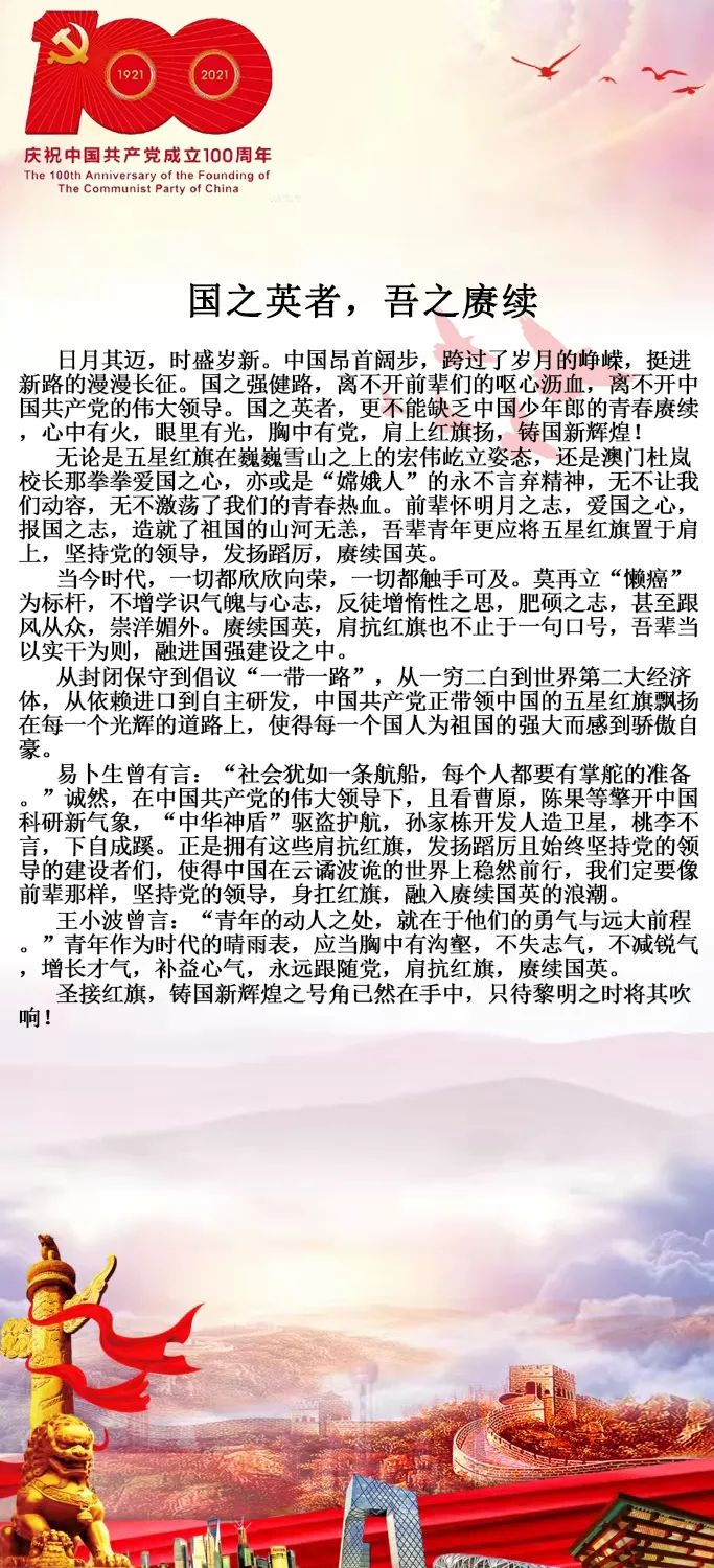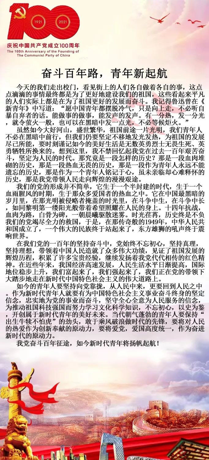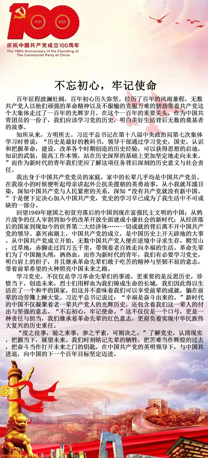 百年征程波澜壮阔,百年初心历久弥坚。在中国共产党的正确领导下,中华民族实现了从站起来、富起来到强起来的伟大飞跃。回望过往的奋斗路,眺望前方的奋进路,必须把党的历史学习好、总结好,把党的成功经验传承好、发扬好。为深入学习党史,延续红色血脉,BG大游特举办“心中有党,坚定逐光”主题征文比赛。BG大游的青年学子们积极参与其中,纷纷表达出对祖国最深沉的热爱和对党最崇高的敬意。最终有7名同学的作品脱颖而出,现将优秀作品予以展示。