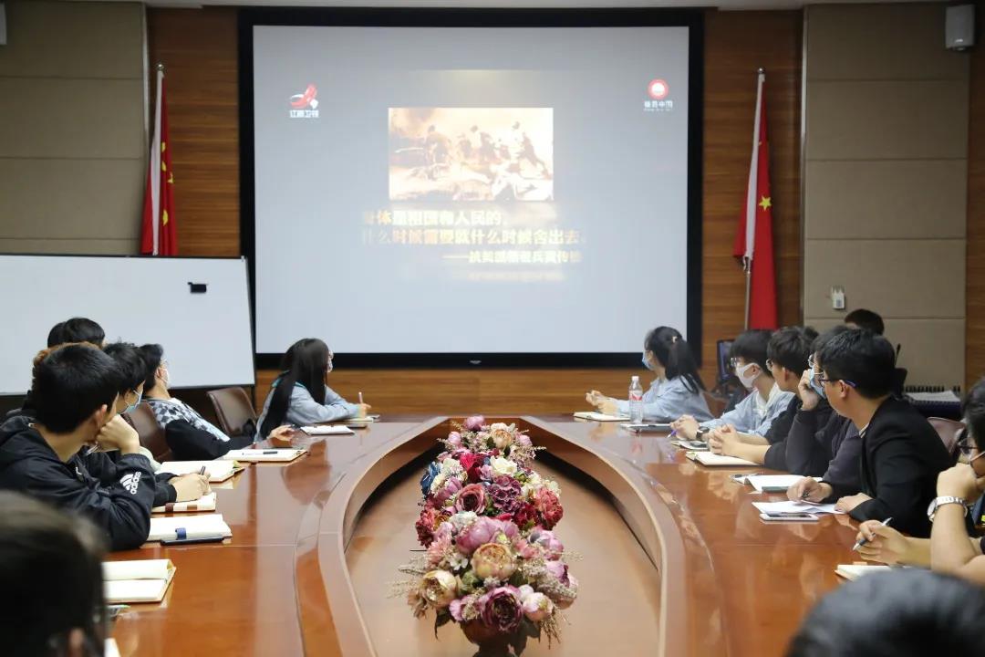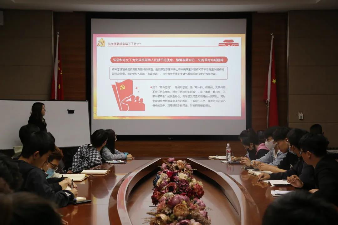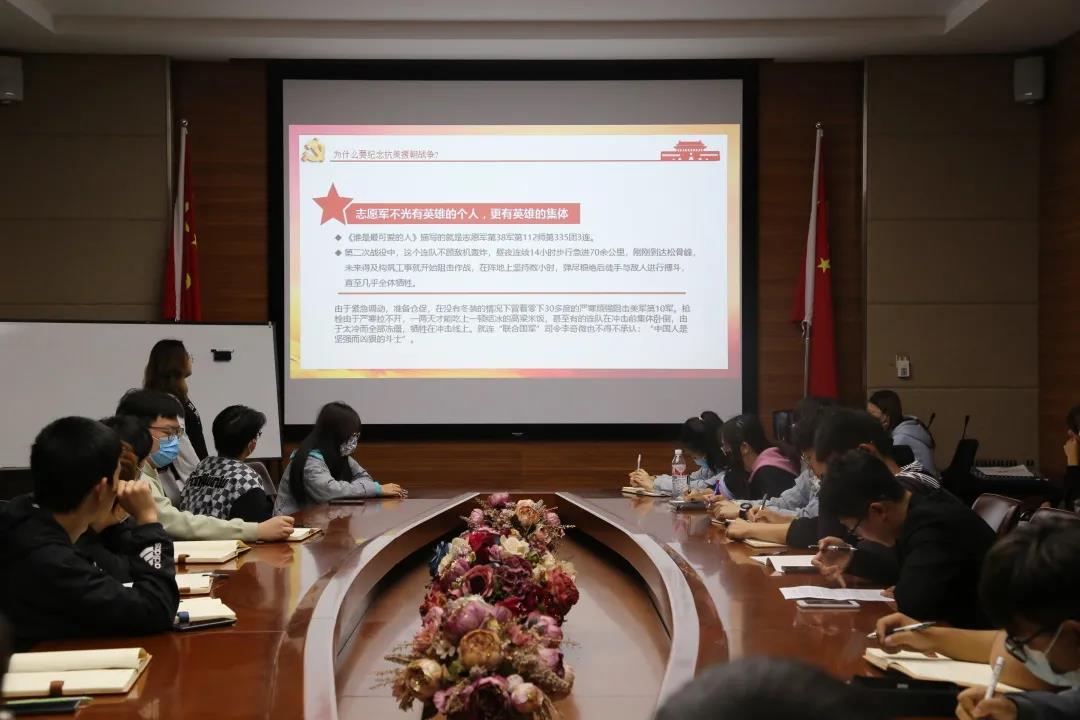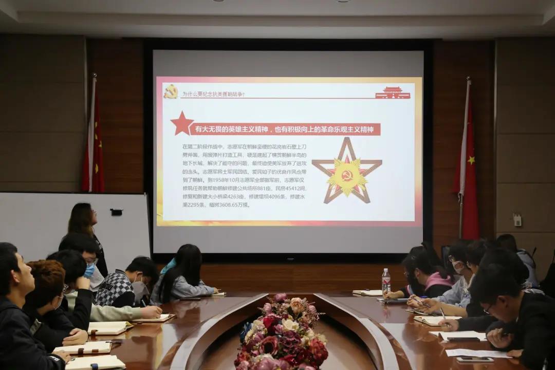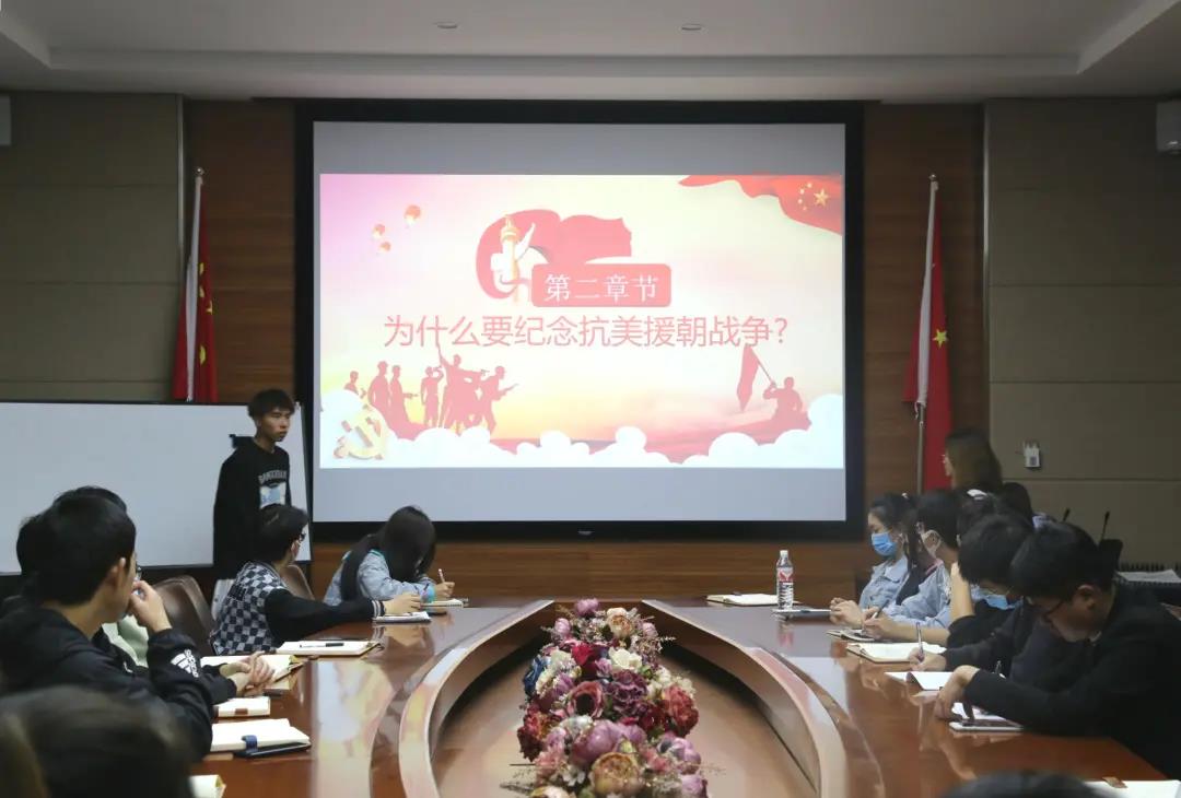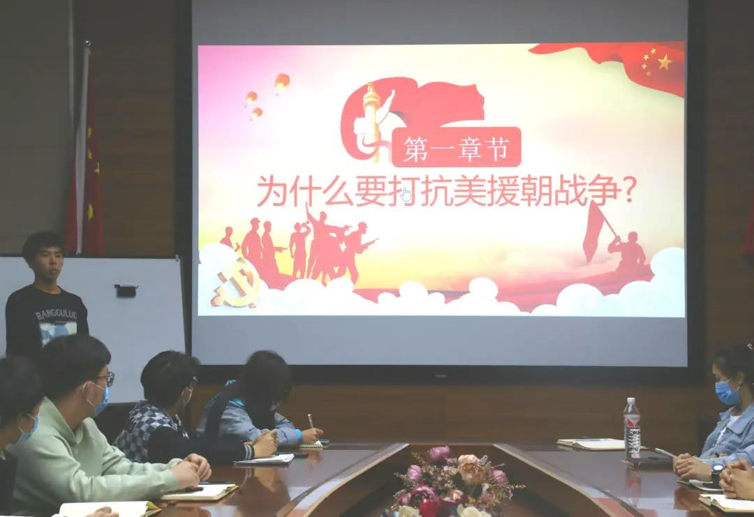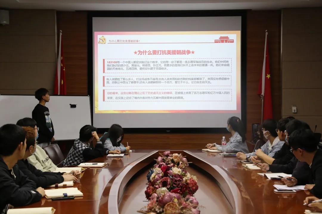 此次会议以“学习抗美援朝精神”为主题,汇报人为BG大游数据科技2005班的同学。出席本次会议的有团委裴弼赢老师、团委副书记丁方一学长、黄伯腾学长、刘庆鹏学长以及大二各班班长、团支书、组织委员和宣传委员。