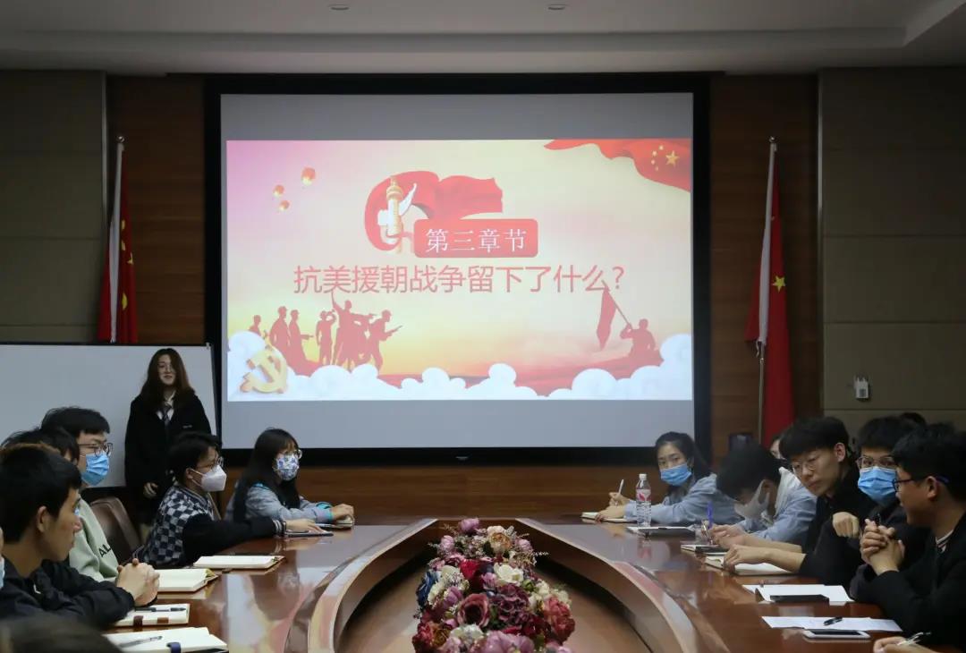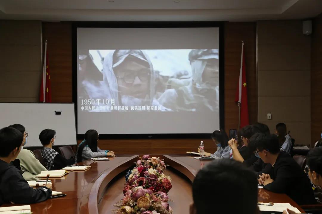 裴弼赢老师为本次讲谈会做了总结:裴老师先是向我们推荐了《跨过鸭绿江》这部电视剧。《跨过鸭绿江》首次以国际视野全景式呈现了抗美援朝战争全过程,从中央决策、志愿军将领指挥到志愿军战士无数次血战,再现了70年前那段波澜壮阔的历史,高度还原了70年前那群“最可爱的人”可歌可泣的英雄事迹。希望同学们多观看此类题材的影视剧,充实自己闲暇时光的同时也能够了解历史。随后,裴老师表示弘扬抗美援朝精神,新时代青年不仅要厚植爱国主义情怀,也要树立英雄主义理想。总书记强调:“当代中国,爱国主义的本质就是要坚持爱国和爱党、爱社会主义高度统一”,青年学子要深刻理解把握爱国主义的本质,忠于党、忠于国家、忠于人民,在党史学习教育中汲取砥砺奋进的力量,迸发新时代爱国主义伟力。抗美援朝战争中涌现的英雄人物众多,在成为英雄之前他们也曾是志愿军中普通的一员,正是因为具有英雄主义精神的平凡人在特殊环境下做出非凡举动才成为了英雄。因此,英雄与平凡从来不是对立的。生长在和平年代的我们没有经历过战场的硝烟,但是当中国特色社会主义进入新时代,当民族复兴重任的接力棒传递到我们手中的时候,平凡的我们非常需要英雄之志。因此,青年学子要树立英雄主义理想,把个人理想融入时代主题,在崇尚英雄、学习英雄的同时,争做平凡英雄。