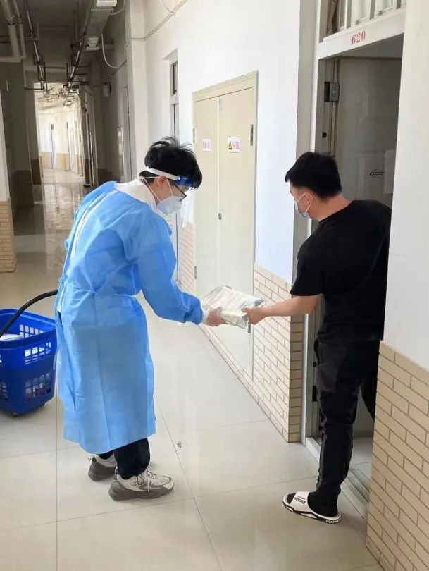 集团的防疫工作井然有序,辅导员和同学们一起住在员工宿舍,随时为同学们排忧解难,保证员工各项工作正常进行,几天一次的核酸检测分楼层进行,采样过程快捷高效。每天需要向各个寝室分发抗原检测试剂盒,让同学们在寝室内自行进行抗原自测,极大程度地避免了聚集的情况。饮食方面,每天的餐食都包裹着保温袋,保证饭菜是热腾腾地送到同学手中。