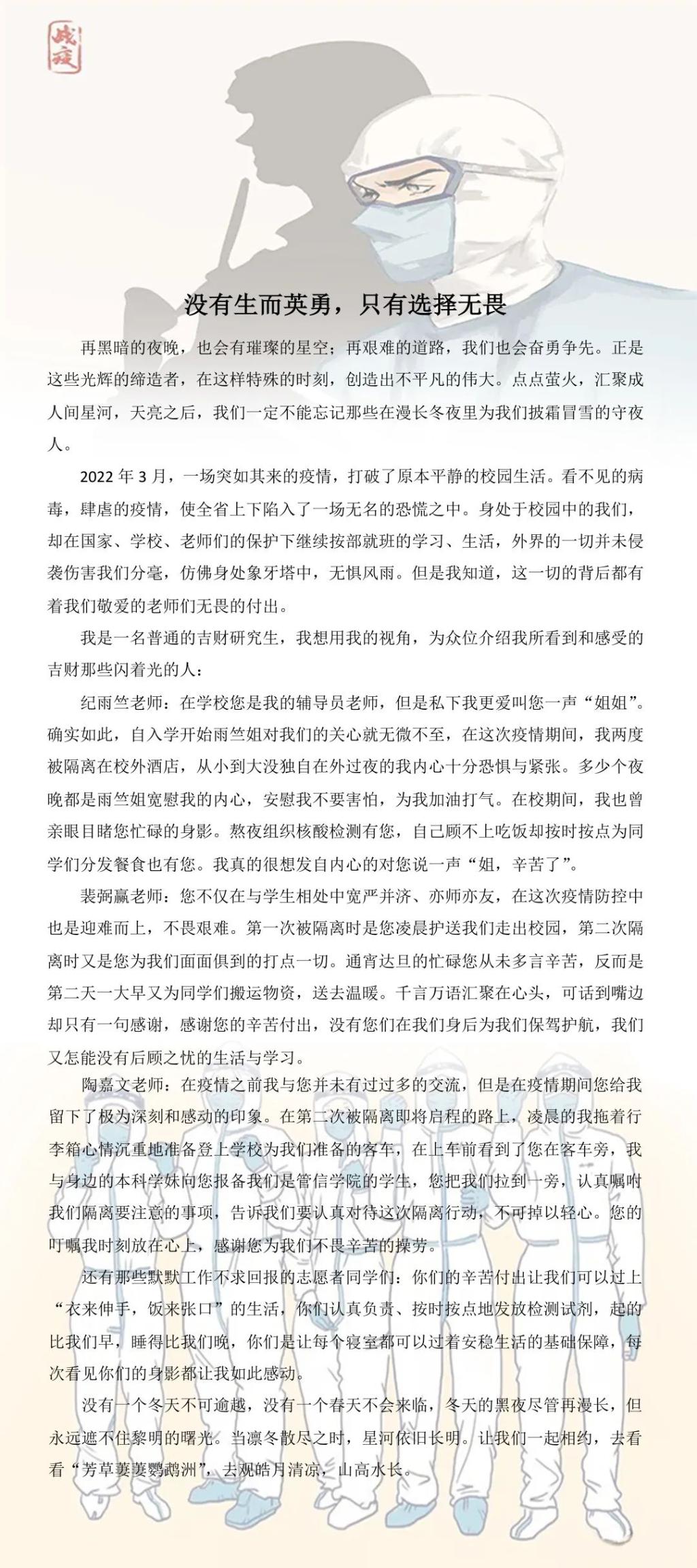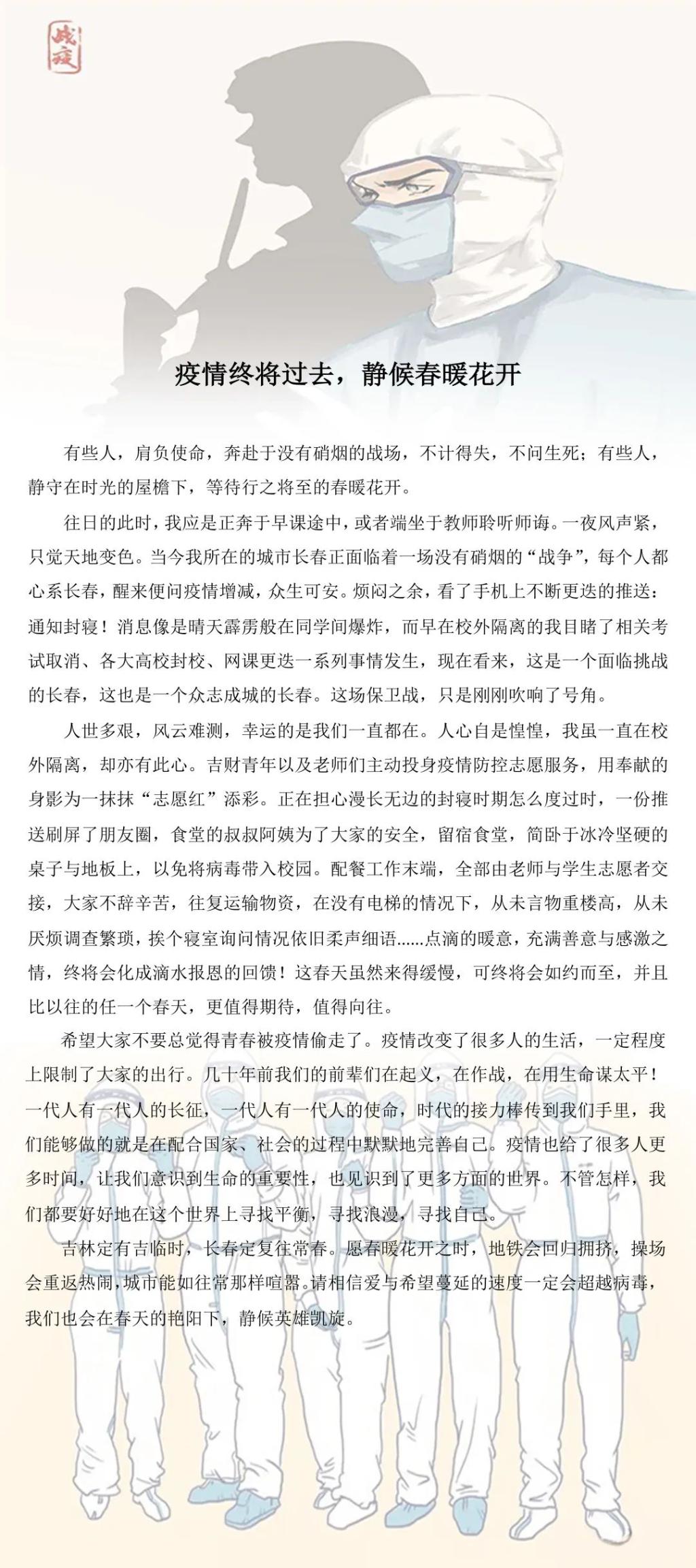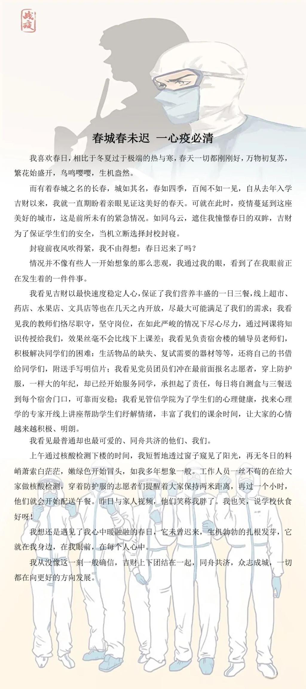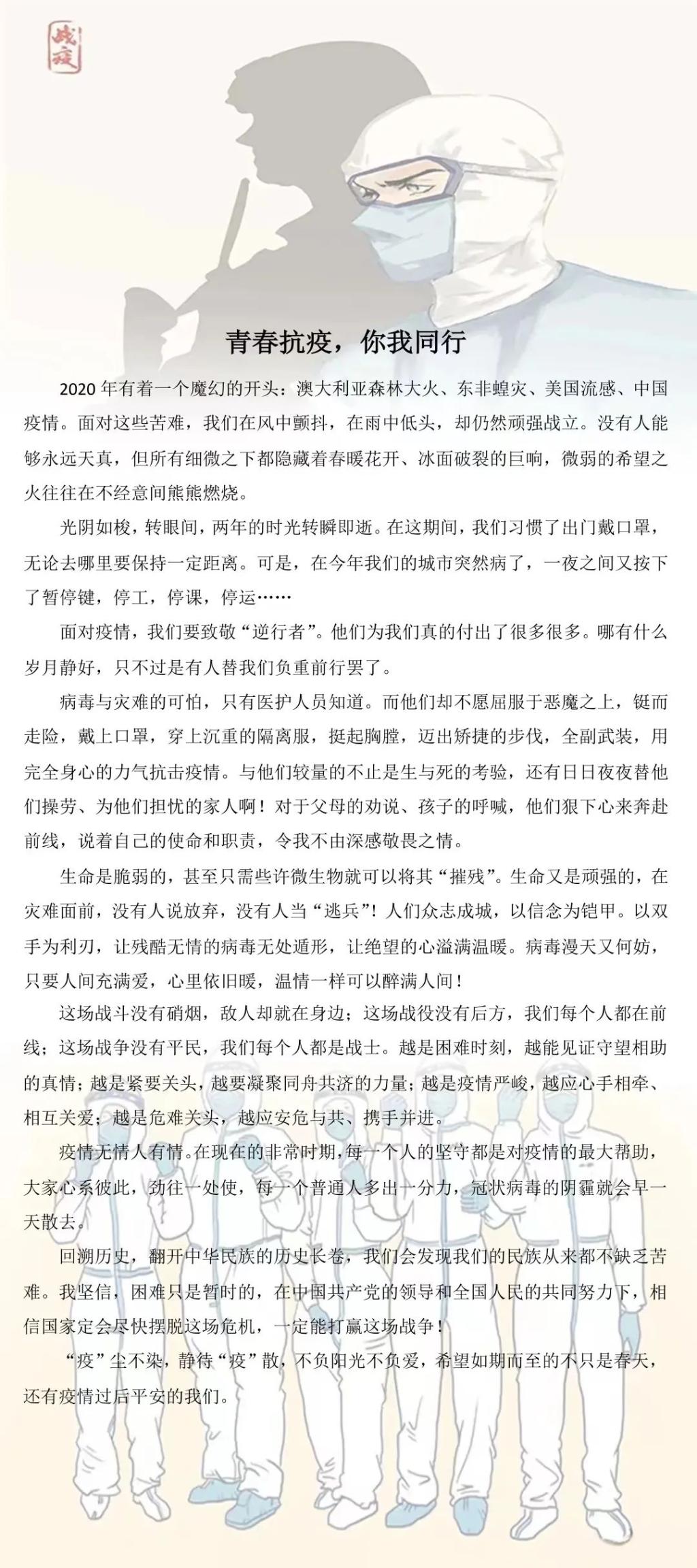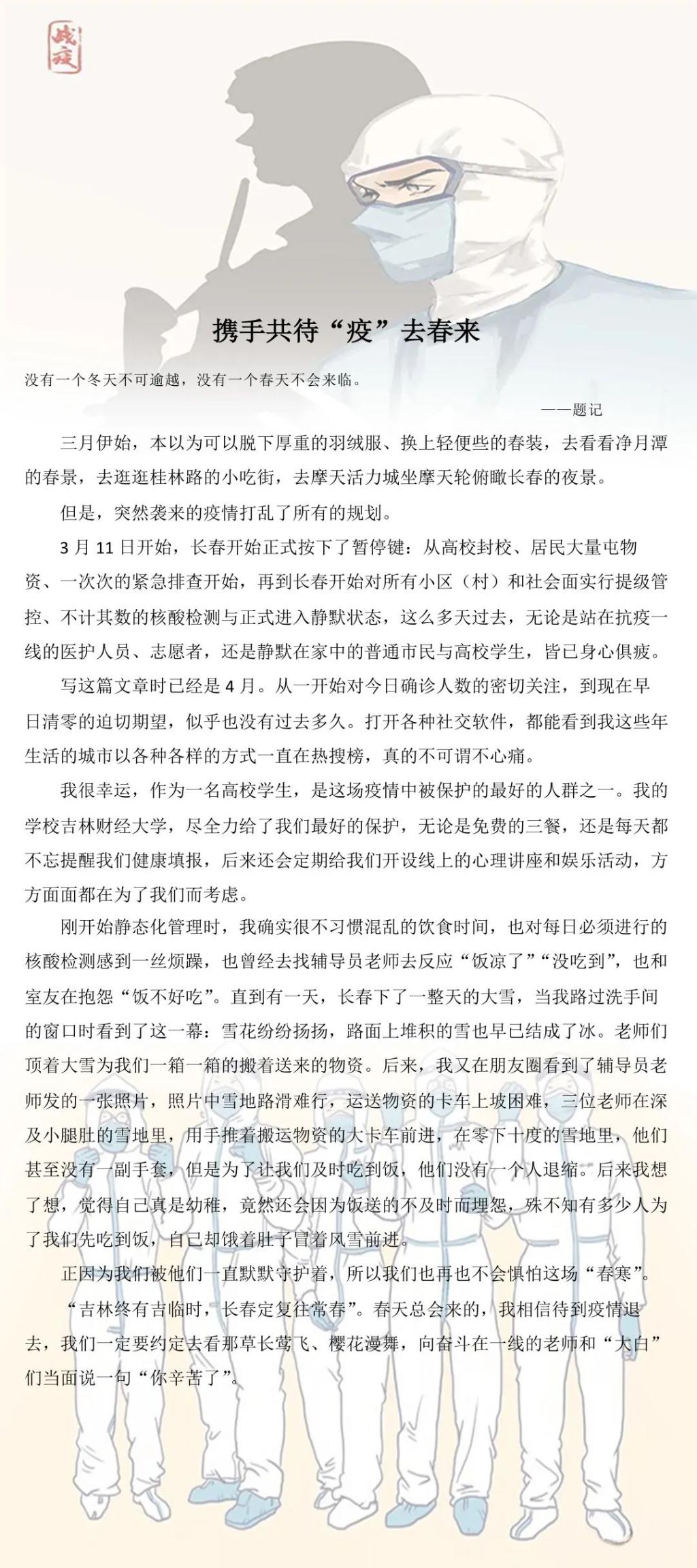 2022年春,一场突如其来的疫情席卷了本该春意盎然的北国春城,公司紧急启动措施,宿舍封闭式管理、线上授课,一瞬间,热闹的校园被按下了暂停键。为了丰富同学们在静态管理下的校园生活,BG大游举行了“青春抗疫,你我同行”主题征文活动。在此次活动中同学们发自内心记录了当下疫情生活的真切感受,用文字无声地支持着广大奋战在各自岗位上的抗疫人员。在同学们的积极参与下,涌现出了许多优秀的作品,以下为此次活动的优秀作品展示。