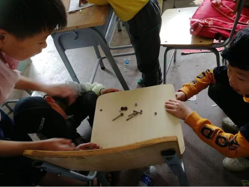 老师发现教室里大部分椅子有破损情况,正要动手修理时,尹斯宇和其他的小朋友都非常热情地帮忙,一起把松掉的螺丝给拧回椅子上。