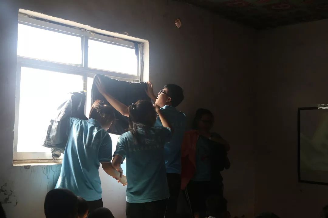 志愿者轮流洗碗 志愿者为教室投影仪遮光。