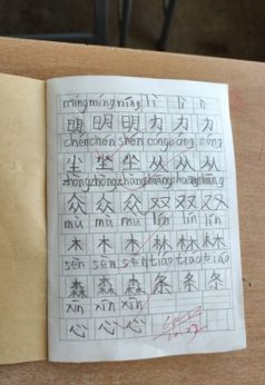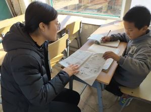 在比吉财的教室要小很多但却干净整洁的教室里,阳光暖洋洋的洒在书桌上。志愿者们与孩子们愉快的互动,志愿者们为孩子们批改作业,从课本中挑出几个汉字指导孩子们拼写出来。