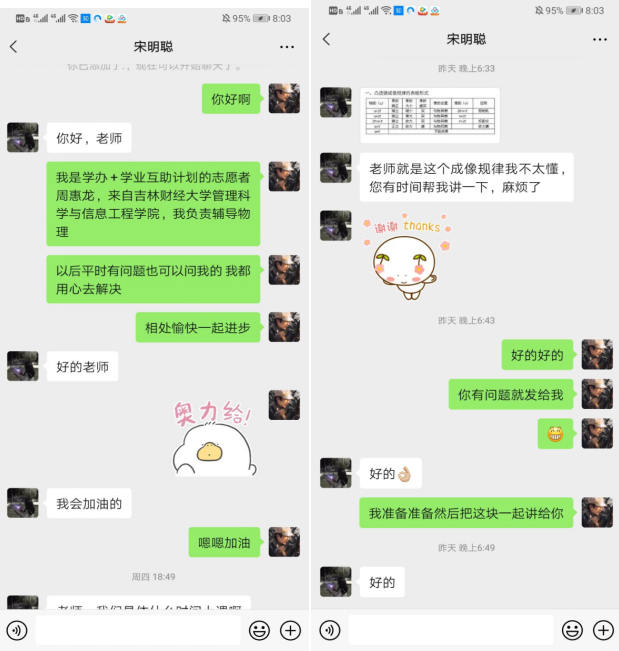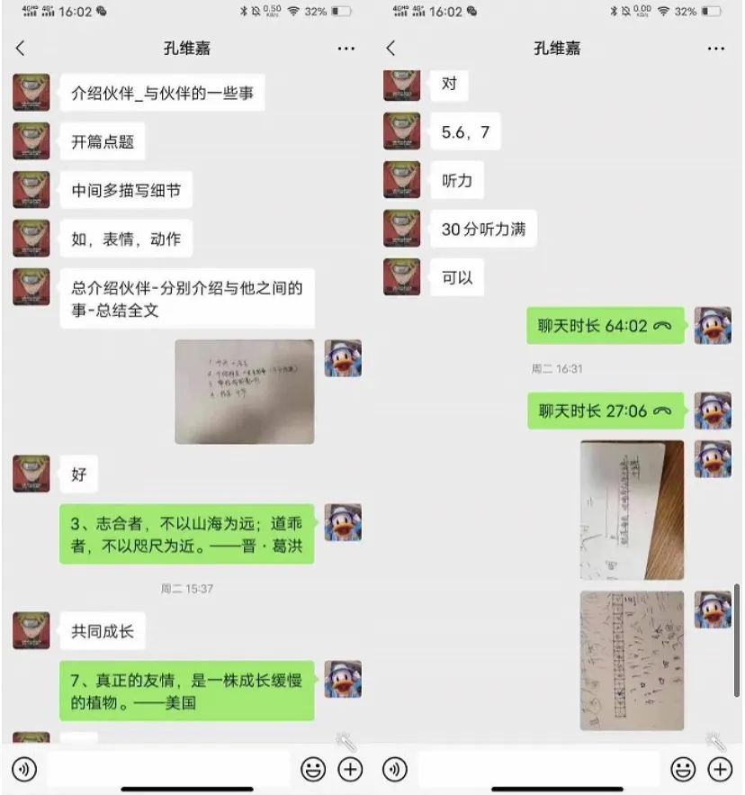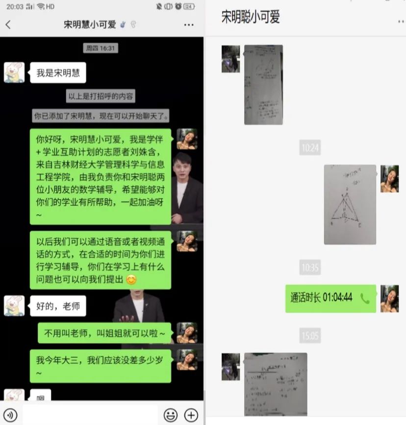 收到学长家长联系方式的那一天,我立刻就联系了家长,打电话之前非常忐忑,怕被误会成骗子,所幸两位孩子的家长对学伴+活动有所了解,我们小组辅导的是一对双胞胎,因为每个人学习情况不同,所以我们针对每个人分别展开询问。我负责的科目是数学,姐姐数学上是代数部分比较吃力,而妹妹却是几何相对不好,这让辅导数学的我感到头疼,只能让两个人将不会的题目分别拍给我,我再单独给每个人通过语音通话讲解,但两个人都很好学,即使是给姐姐讲代数知识,妹妹也会在旁边一起听,辅导结束后,还会认真完成我留的小作业;遇到不会的问题也会积极向我提问。两个员工学习情况虽然不同,但都很认真对待学习,主动的学习态度,让我更有信心帮助到她们,让他们从学习中找到兴趣。