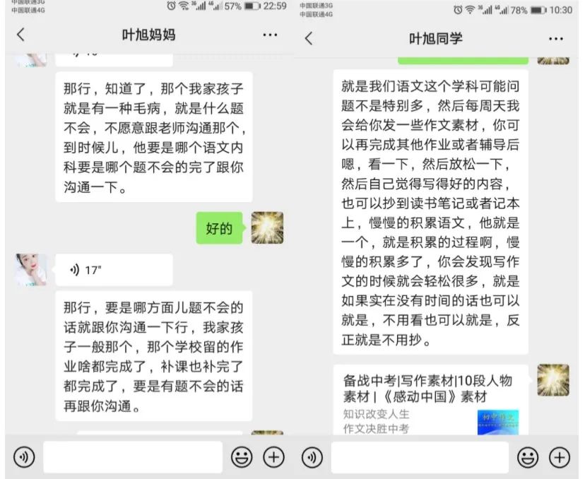 在和家长的交流中我们获得了很多的信息:孩子没有手机,只能使用妈妈微信进行联系,孩子性格比较内向,有不会的题时也不太爱问老师。但是同时在日常学习中也十分的自觉,能够按时完成老师布置的作业。是个十分优秀的孩子。虽然条件比较艰苦,但我们的辅导不仅仅只是停留在他问我答,我们也从很多地方帮他搜集了一些资料,每周天给他发一些,希望可以扩宽他的眼界,增长知识面,为以后打好基础,叶旭同学也十分配合,学习十分刻苦。