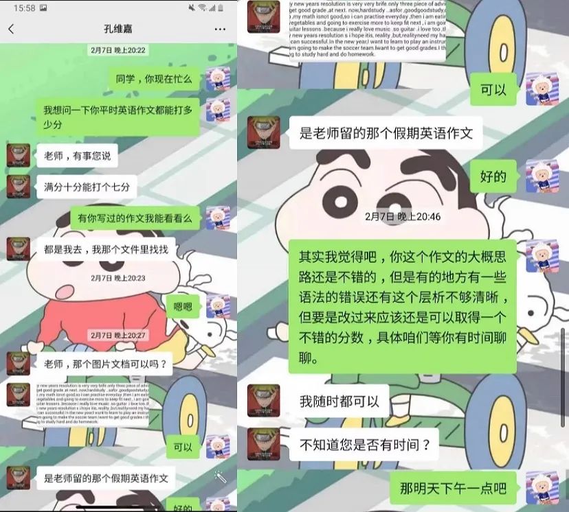 这个寒假我对孔维嘉同学的学习进行了帮助,他态度认真,对知识的求知欲望很强。在英语作文方面他向我提出了疑问,于是我针对英语作文对他进行授课。在正式授课之前,对他的疑惑点进行了学习资料的查询并为其设计授课方案,并为他提供学习积累材料。我和孔维嘉同学采取微信语音通话的方式进行授课,在授课过程中,孔维嘉同学认真积极的配合我,除了授予知识外,我还会偶尔分享给他一些小故事来调动他的学习积极性。从中我们都感受到了一起学习的乐趣。