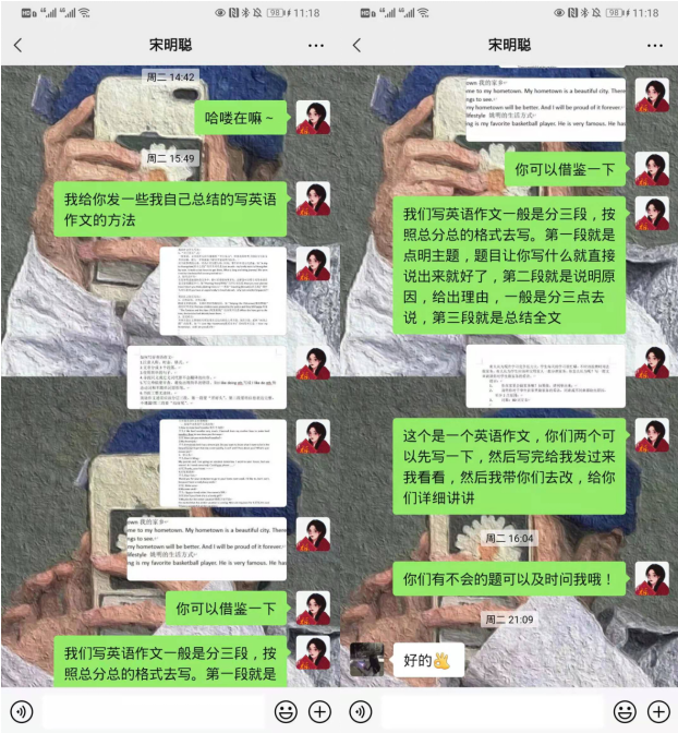 进行完两次辅导之后,我觉得宋明聪和宋明慧两个小朋友有一定的英语基础,只是在语法、阅读的一些方面比较薄弱。上周在给她们进行语音讲解时,她会与我进行互动,回答我的问题。她们两个的学习态度都比较积极。在这周我给她们总结了英语作文的写作方法,并留了一个英语作文的作业。对于第一次进行授课的我,很多事情我也是比较生疏的。希望在教她们两个学英语的同时,我能提升自己的责任感,逐渐将授课变得熟练,帮助她们提升英语成绩!