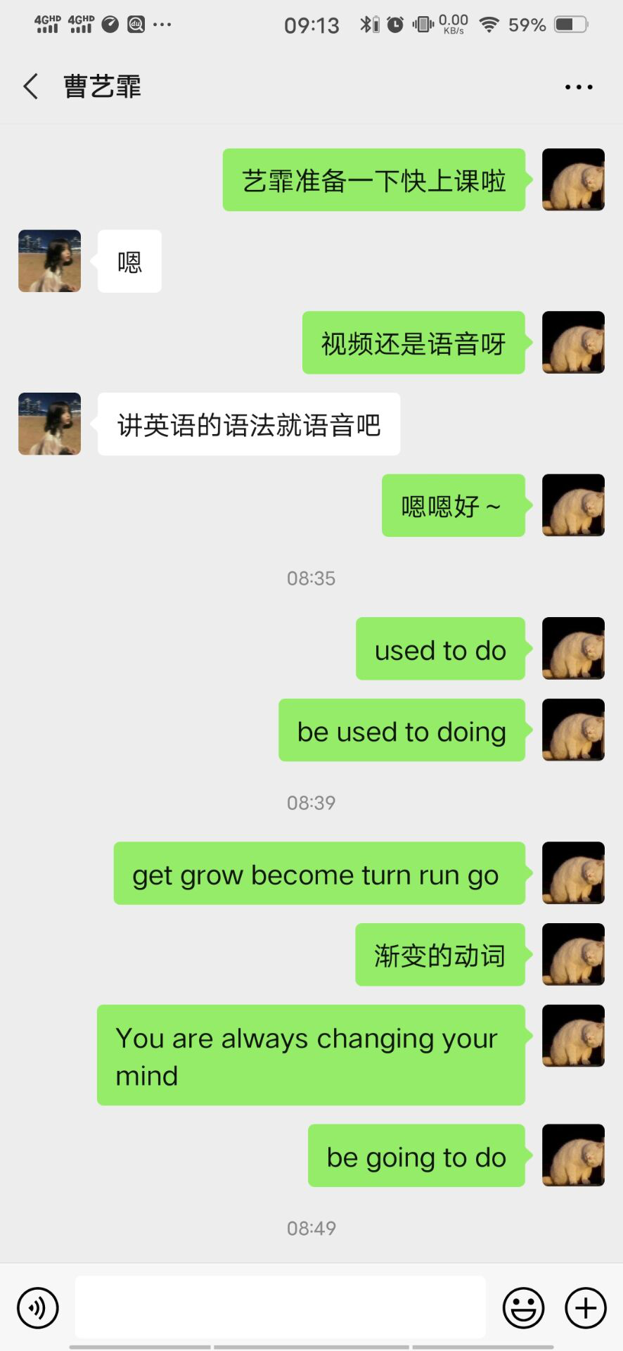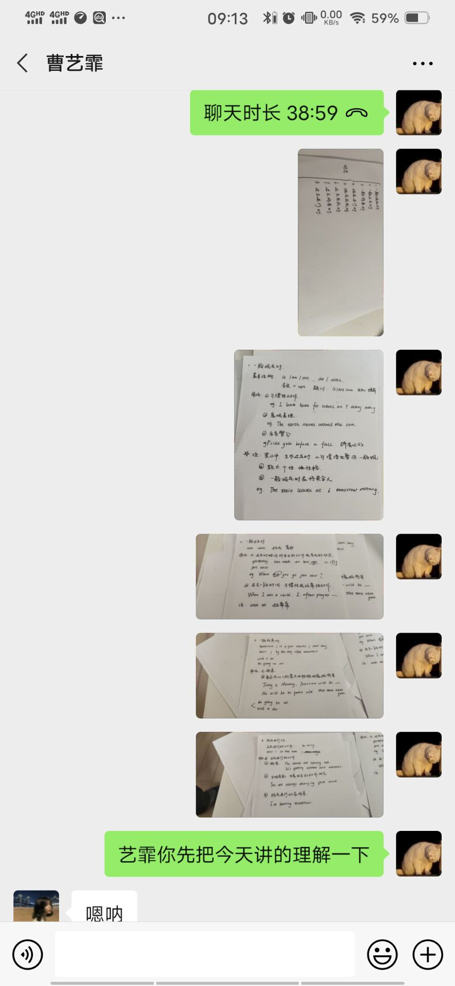 正式辅导第一周,在上课之前,我和艺霏通过微信进行交流,艺霏表达了自己对于英语语法方面的欠缺,因此第一堂英语课我决定为她讲解时态方面的知识。第一次讲课,虽然已经提前做好了充足的准备,但仍然觉得有些紧张。上课过程中艺霏十分配合,对我提出的问题能认真思考回答,虽然只是短时间的接触,却让我感受到了艺霏扎实的英语基础,以及积极的学习态度。艺霏对于自己的知识短板有很清楚的认知,能够及时表达自己不懂的知识点,并及时与我沟通决定下一堂课的授课内容。我希望自己的微薄之力,能对艺霏有所帮助,也相信通过我们的共同努力,我们的课堂将会更加默契,更加高效。