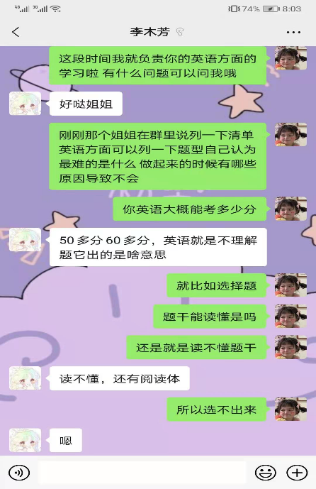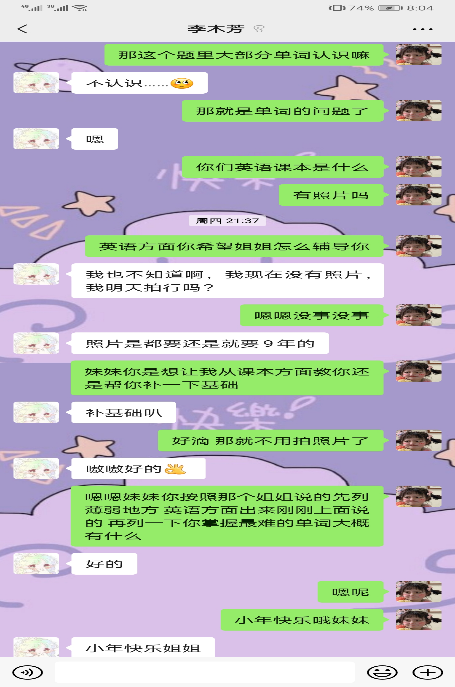 本周通过微信群聊认识了李木芳同学,由于我负责她的英语学习,所以先大致通过简单的交流了解了一下其英语水平。在聊天过程中得知,其英语成绩不高,原因是英语基础较差,单词储备量不足,所掌握的语法较少,因此在本周我通过钉钉针对英语单词方面辅导了李木芳。在辅导过程中,提问了几个基础的英语问题,比如leaf这个单词怎么读,什么意思等。通过李木芳的答案对其英语水平有了详细的了解,因此根据辅导文案,将单词记忆法和名词单复数变换进行了讲解,着重辅导了特殊名词单复数的变换。讲解结束后,通过习题李木芳也掌握了该知识点。