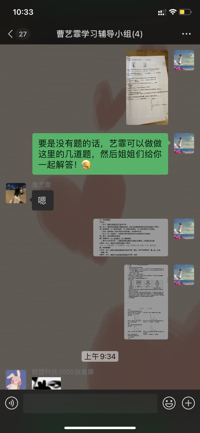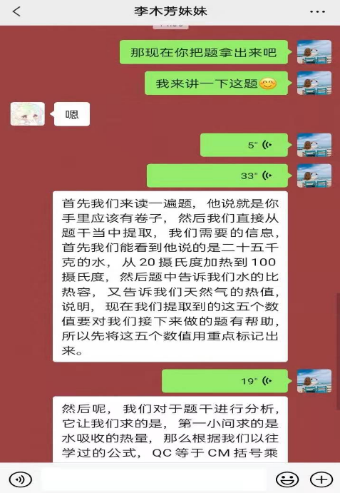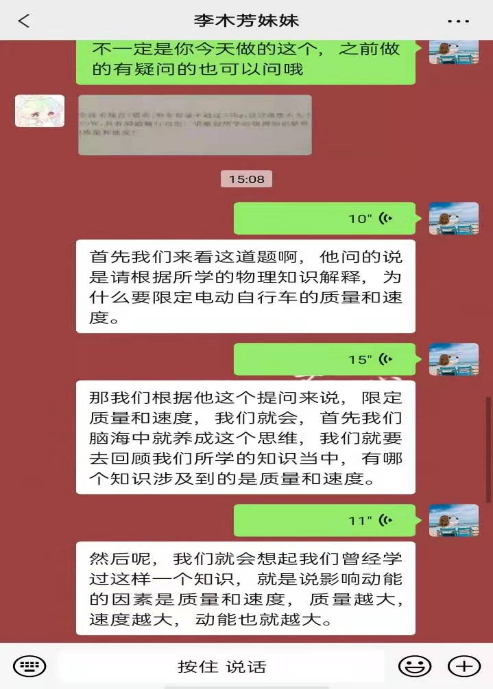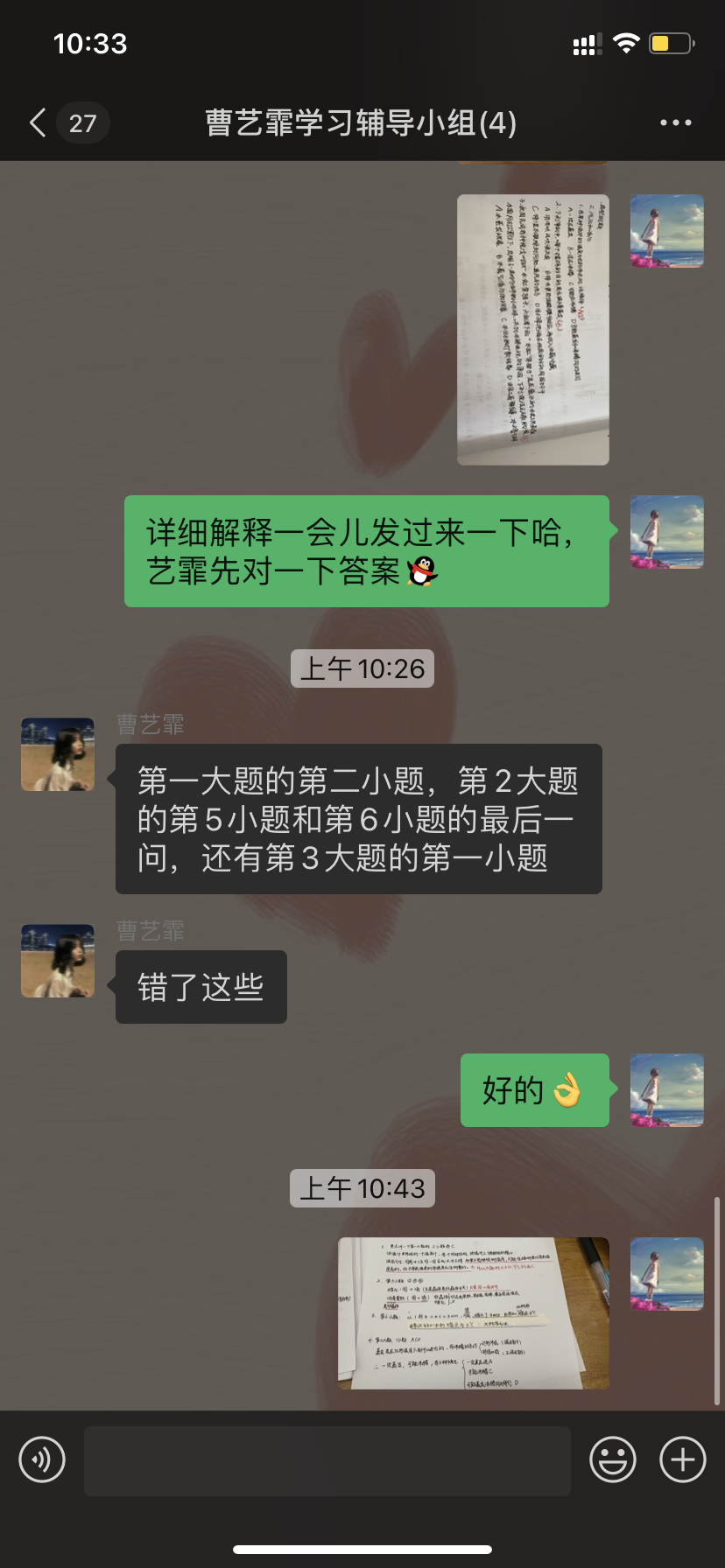 一周的辅导工作结束了,我和曹艺霏妹妹也以视频的形式完成了物理疑难题目的辅导。学习方面,每次辅导之后留的作业,她都会迅速认真地完成,并且及时找我答疑,认真落实好每一道题目的答案。可以看出她是一个努力,有上进心的女孩。每帮她解决一个问题,我也收获了很多。同时她也存在对个别知识点理解程度不高,比如凝固点的理解、体温计的使用、图像的理解,做题的数量少等问题。但我相信,随着我们共同的努力,这些问题都会被一一解决。这次线上辅导对我来说不仅是一次挑战,更是一次蜕变与成长。我也会不断总结经验教训,让辅导工作进行地更好!