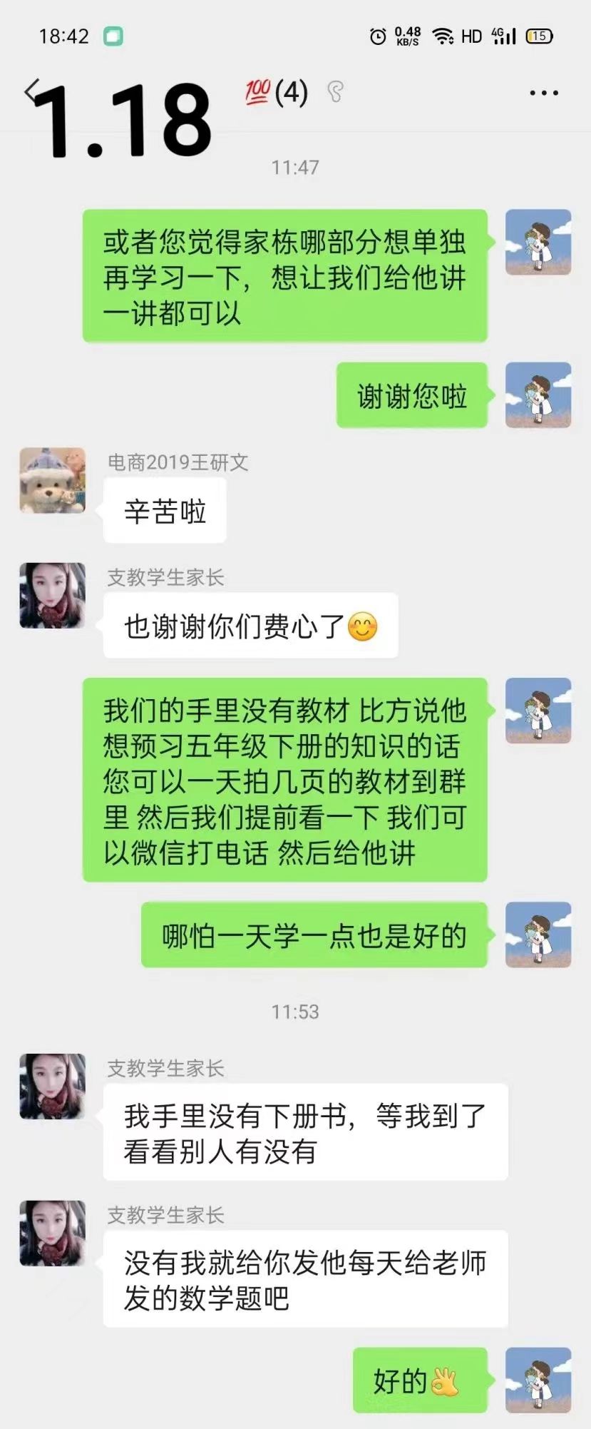 在我大一的第一个学期,我怀着一颗激动且好奇的心,参加了我人生中第一次“支教”,虽然没有与孩子们进行面对面的交流,但我还是能感受到他们的活泼可爱。我负责的是一名来自通榆四中八年级的小女孩张若晗的语文科目,刚开始与若晗妈妈沟通时有点不知道该怎么去交流,但经过一段时间的接触后,我感受到了若晗妈妈的热情与开心,也感受到了若晗活泼开朗,勤学善问的性格,这使我们之间的交流不只局限于学习层面,有时开心的事情也会与我分享,不开心的事情也会与我倾诉。在给她们解答的过程中,有一些来自他们的疑问也是我有时存在疑惑的问题,这可以同时开拓我的思维与视野,可以让我从多方面考虑问题,同时也锻炼我的耐性与表达交流能力,可以使我们双方共同进步。