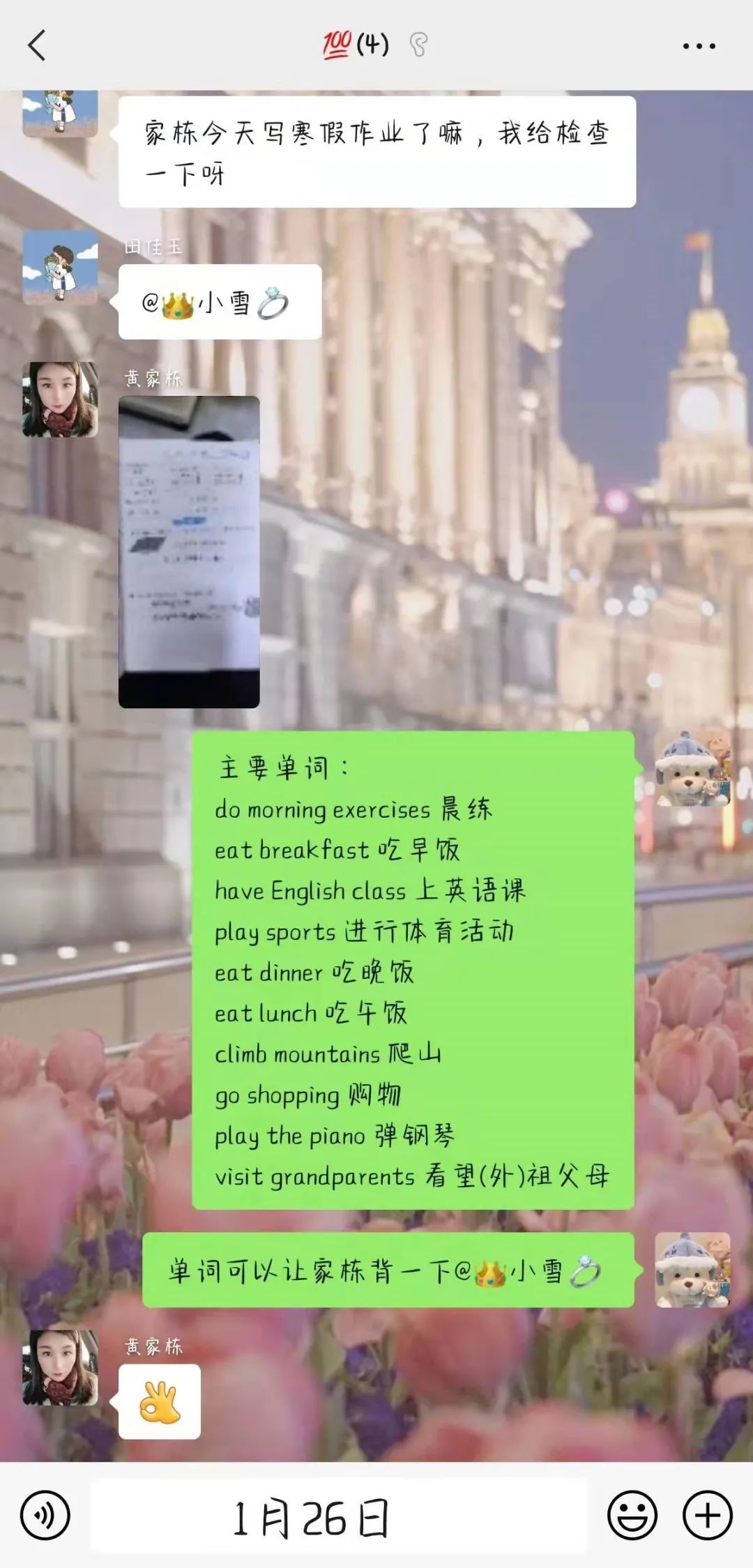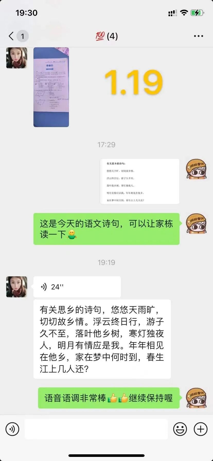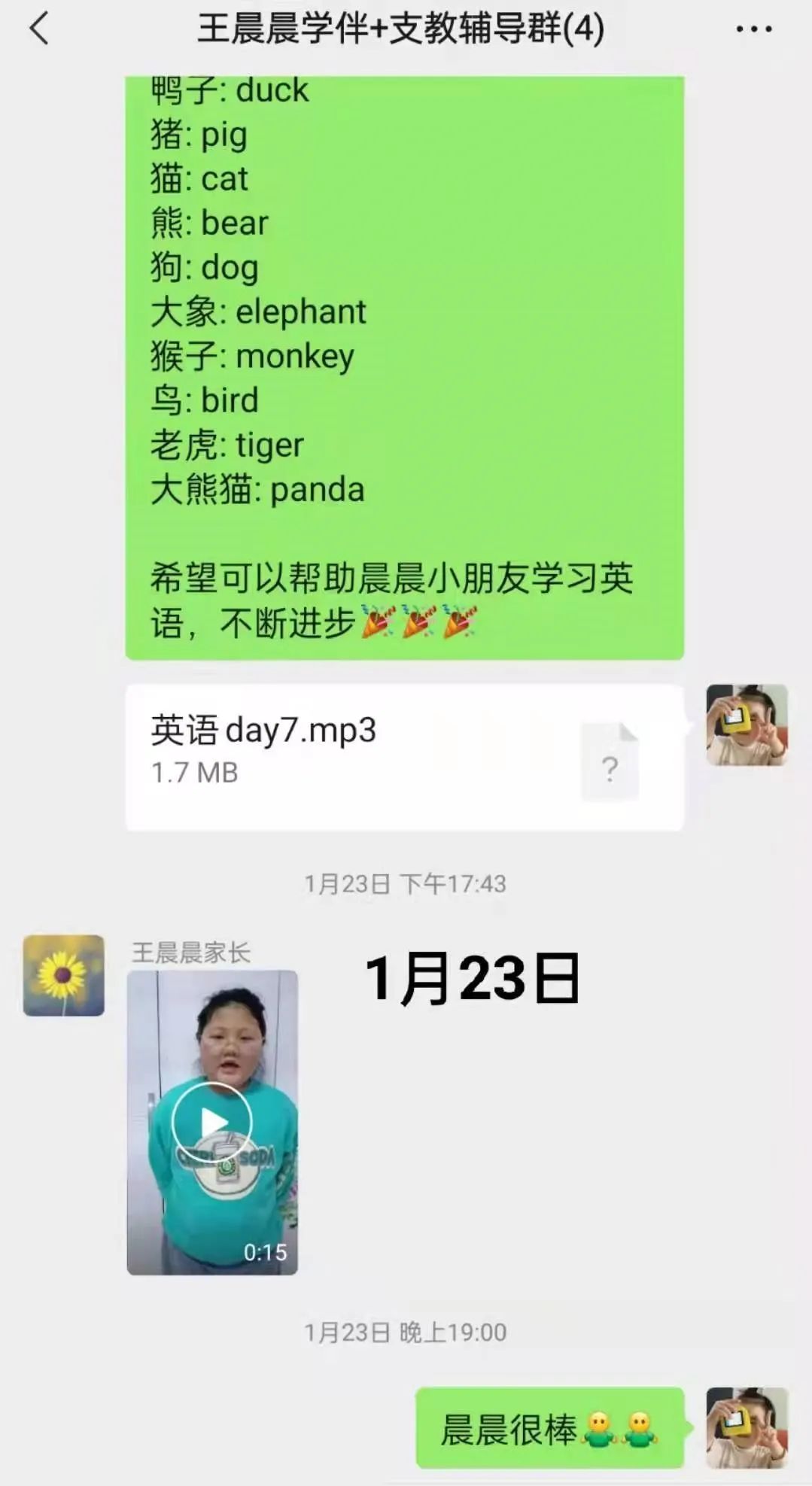 电子商务2019班 王研文 这是线上“学伴+”支教的第二周,答疑工作仍在顺利进行着,家栋的假期英语学习质量在支教小组的带领下进度跟的很好,有很明显的进步,基础知识也有了明显的提升,每天我都会在群里发定量整理好的英语单词和语法知识,并检查家栋的学习情况。培养兴趣是关键,我也在平时的辅导中寓教于乐,采用兴趣式教学,将英语文章中的要点与知识点以通俗有趣的方式传达给他,让他能够更好地接受,家栋的英语学习兴趣也越来越高,希望我们能够继续一起稳扎稳打,英语水平能够更进一步。