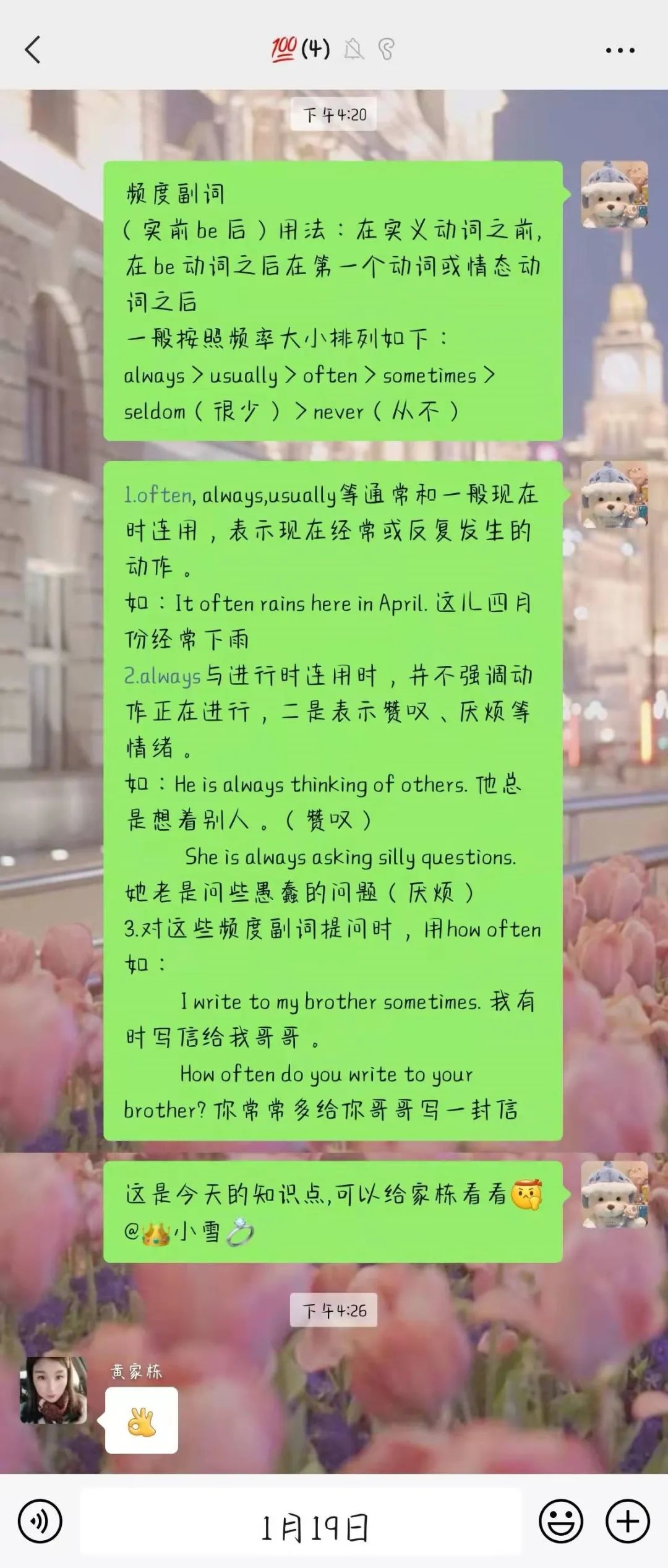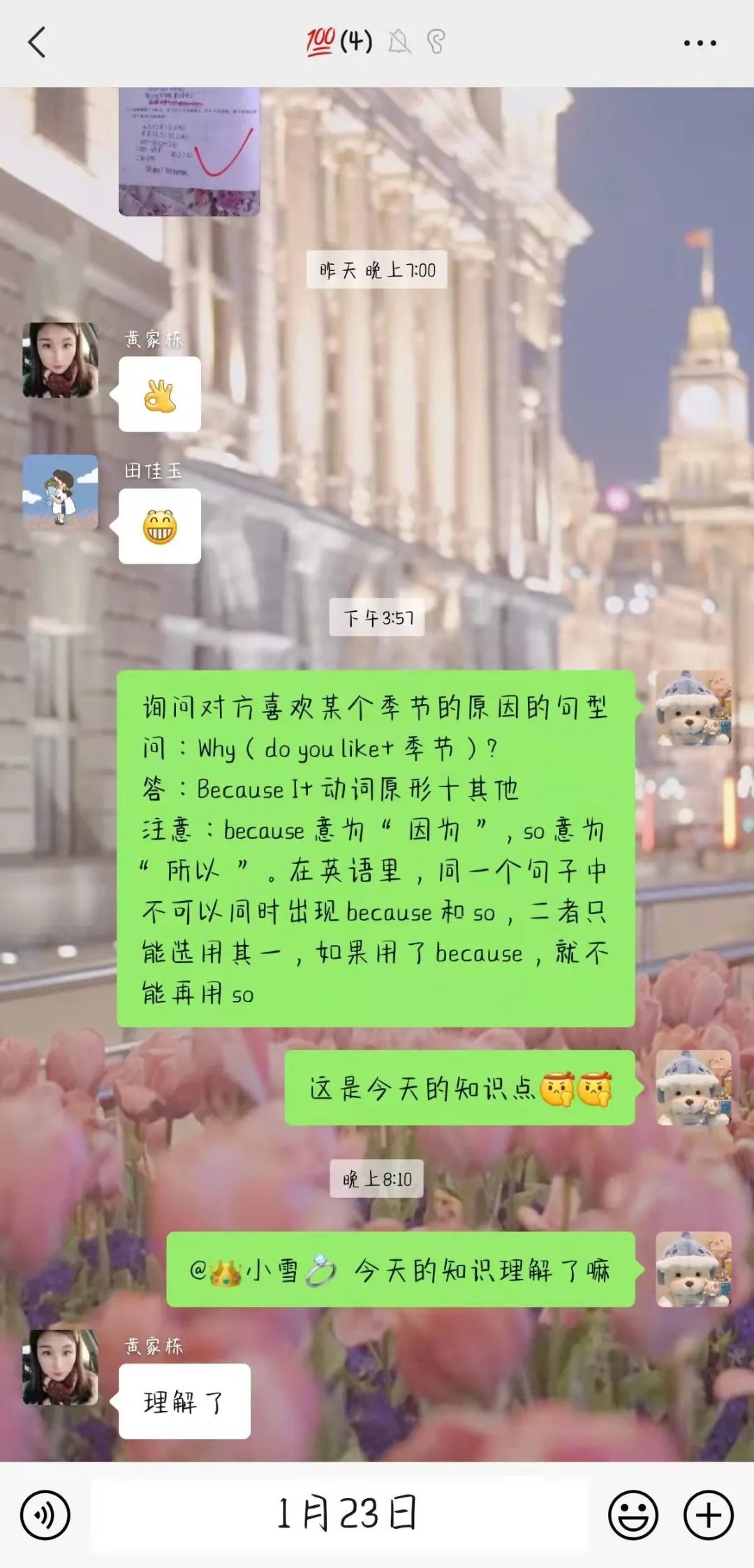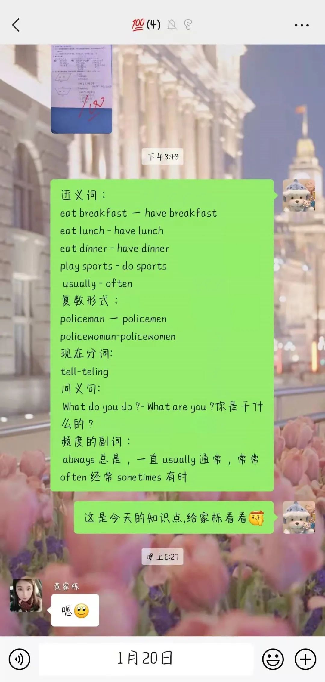 电子商务2019班 王研文 这是线上“学伴+”支教的第二周,答疑工作仍在顺利进行着,家栋的假期英语学习质量在支教小组的带领下进度跟的很好,有很明显的进步,基础知识也有了明显的提升,每天我都会在群里发定量整理好的英语单词和语法知识,并检查家栋的学习情况。培养兴趣是关键,我也在平时的辅导中寓教于乐,采用兴趣式教学,将英语文章中的要点与知识点以通俗有趣的方式传达给他,让他能够更好地接受,家栋的英语学习兴趣也越来越高,希望我们能够继续一起稳扎稳打,英语水平能够更进一步。