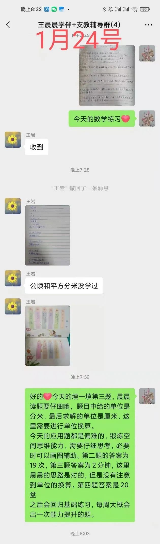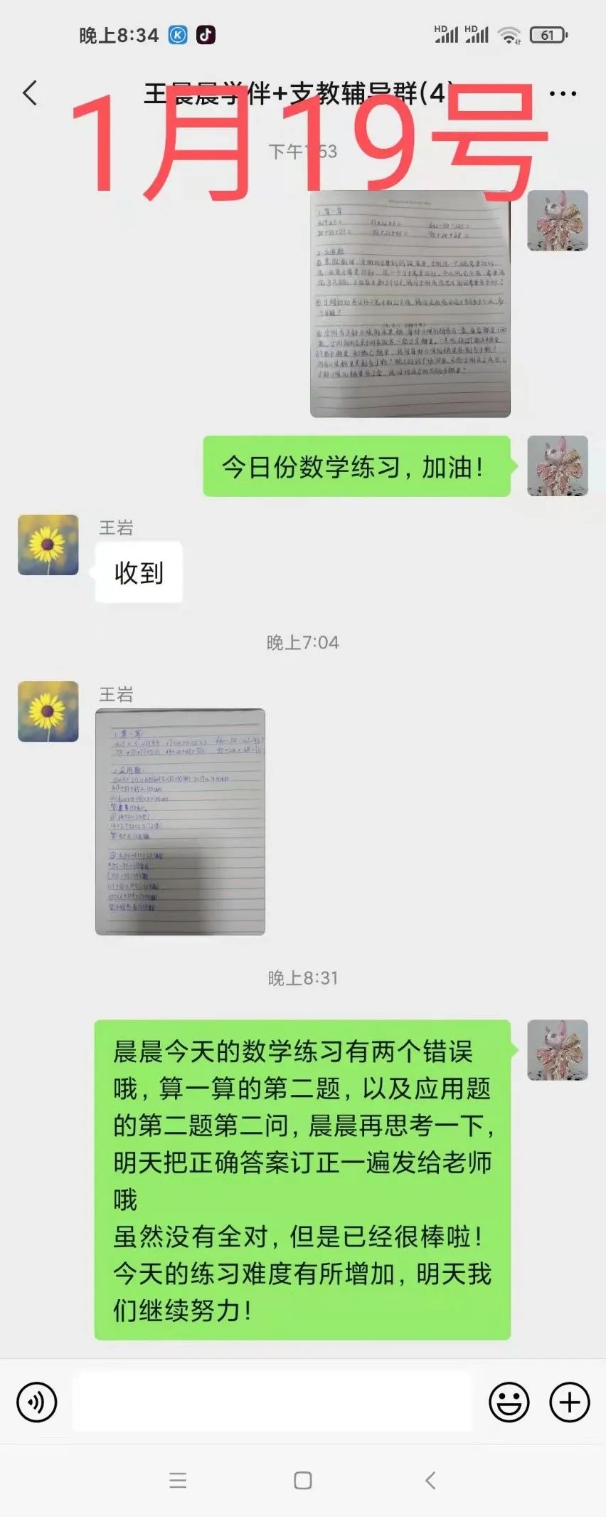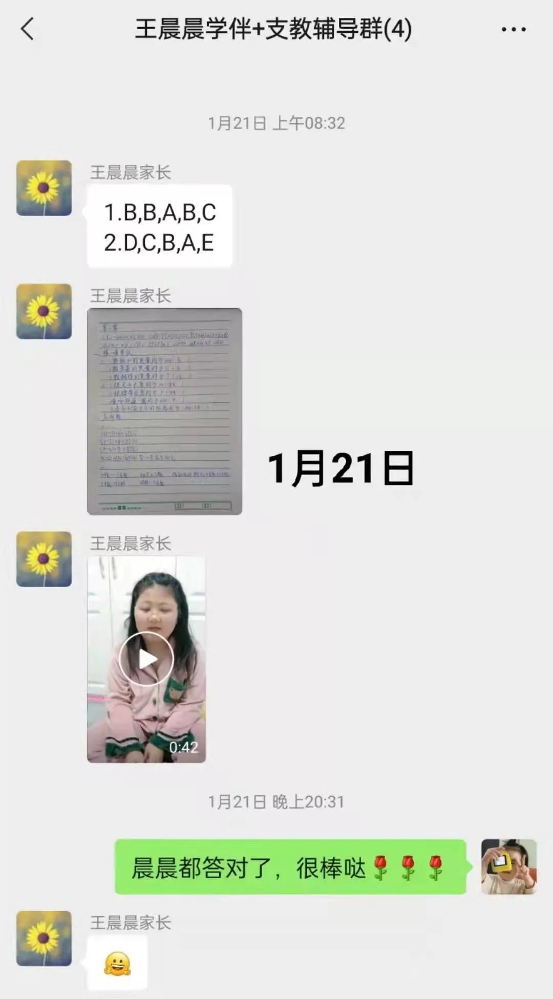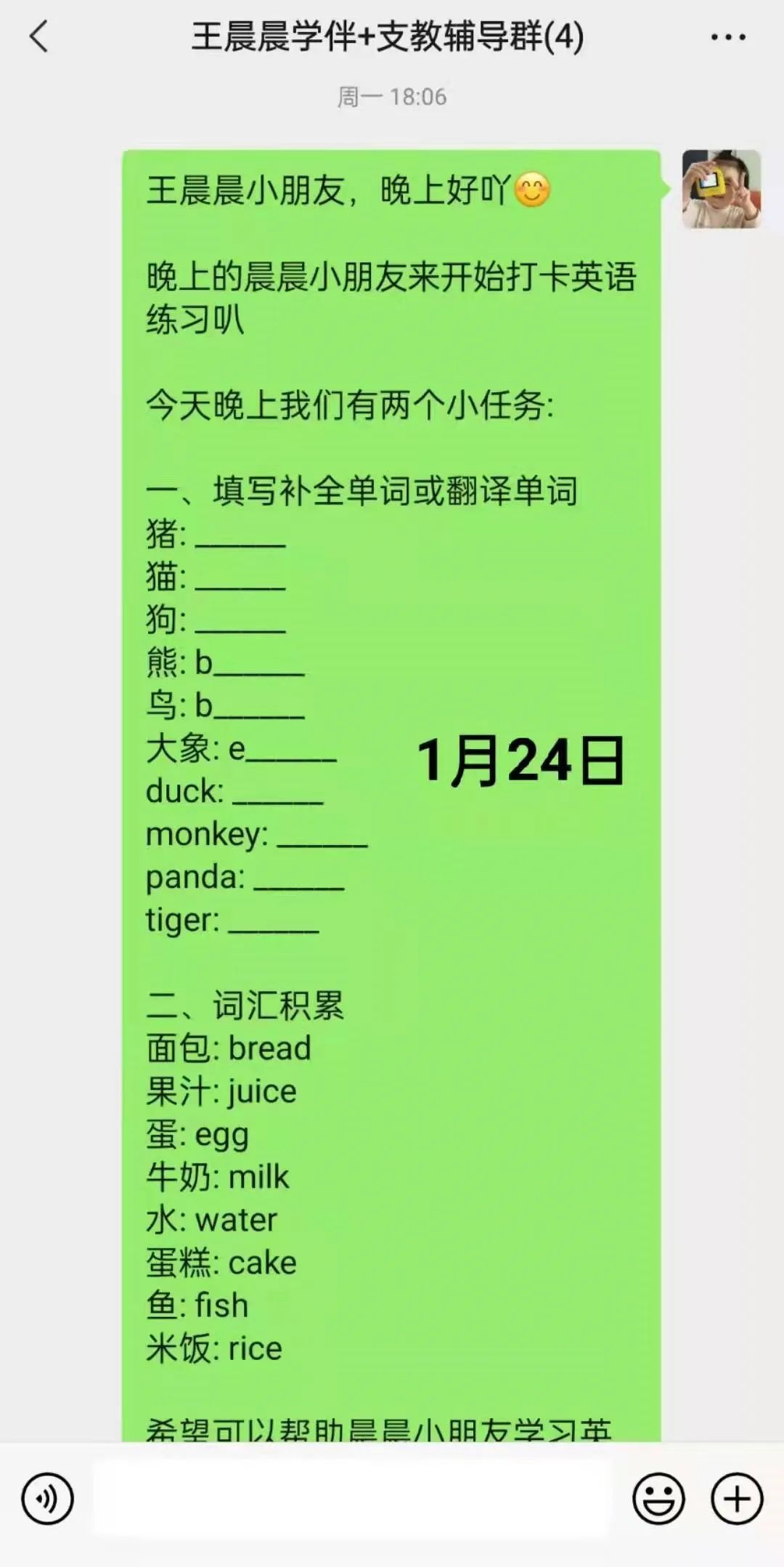 线上支教活动已经进行了一段时间,我们三位老师以及员工家长都已经适应了这种教学模式。晨晨妈妈十分配合我们的工作,晨晨学习也十分努力,虽然每位老师布置的学习任务并不重,但是三科任务加起来也并不轻松,而且晨晨还有寒假作业要完成,并且每天都会进行额外的读书任务,她一直在坚持,从未抱怨,每次的作业都认真完成。作为老师,我的第一个员工就如此认真努力,我也感到十分骄傲,假期已经过完一半,在为数不多的日子里,我们会继续和家长一起陪伴孩子学习,更加认真努力完成辅导任务。