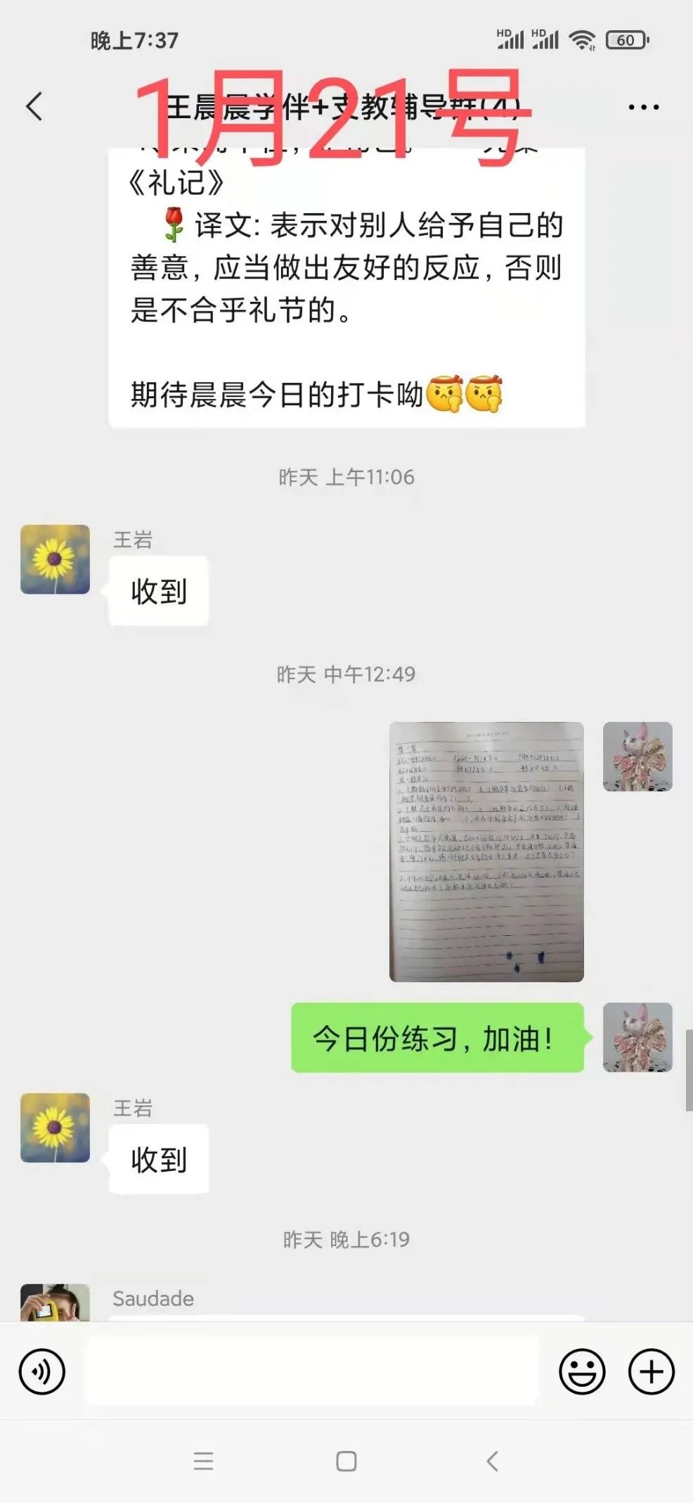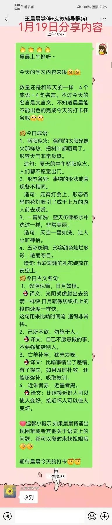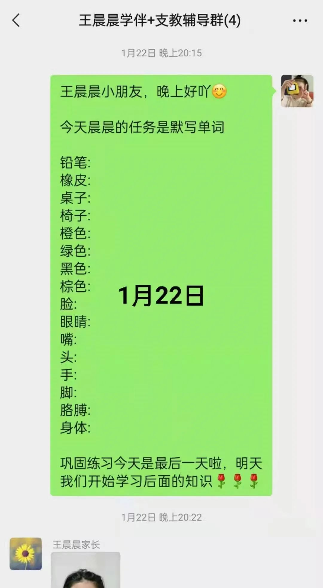 线上支教活动已经进行了一段时间,我们三位老师以及员工家长都已经适应了这种教学模式。晨晨妈妈十分配合我们的工作,晨晨学习也十分努力,虽然每位老师布置的学习任务并不重,但是三科任务加起来也并不轻松,而且晨晨还有寒假作业要完成,并且每天都会进行额外的读书任务,她一直在坚持,从未抱怨,每次的作业都认真完成。作为老师,我的第一个员工就如此认真努力,我也感到十分骄傲,假期已经过完一半,在为数不多的日子里,我们会继续和家长一起陪伴孩子学习,更加认真努力完成辅导任务。