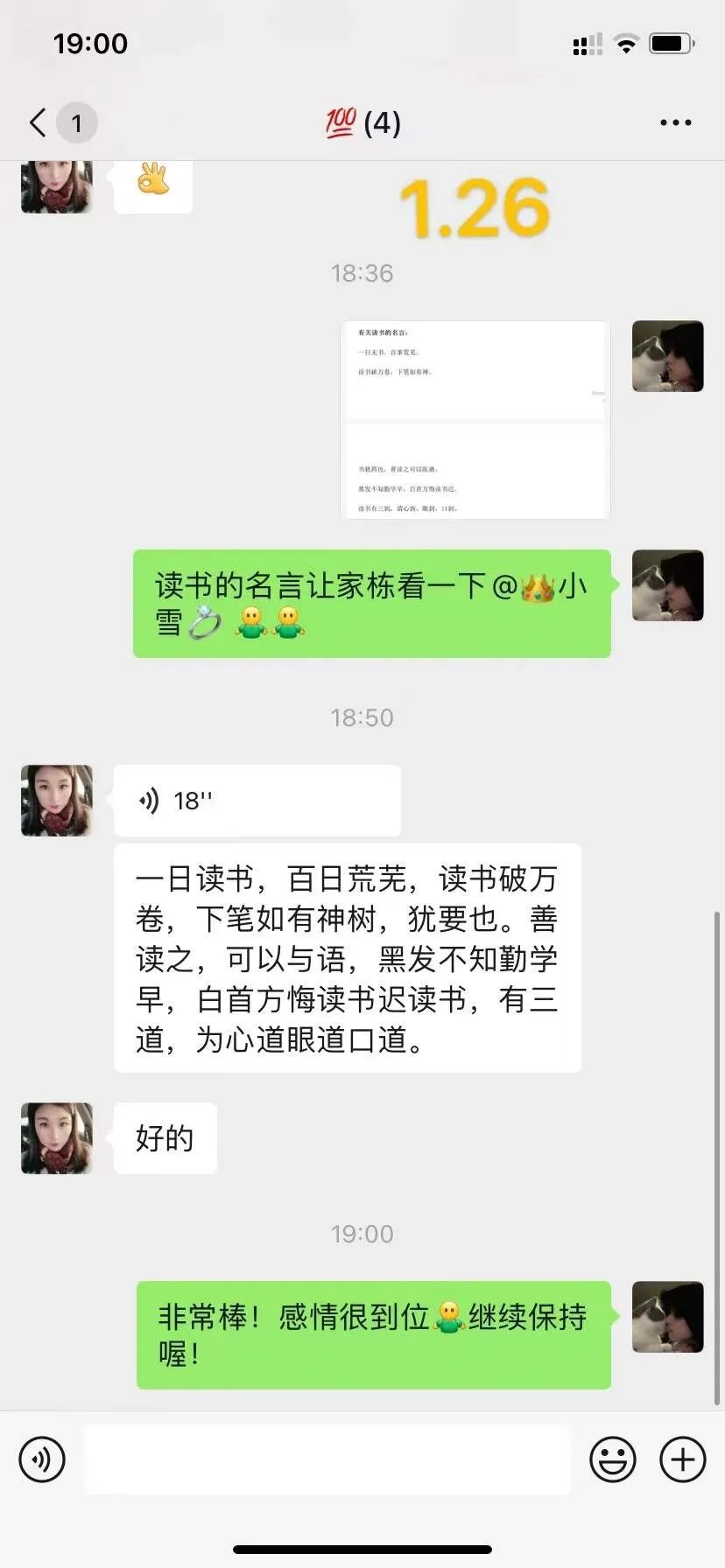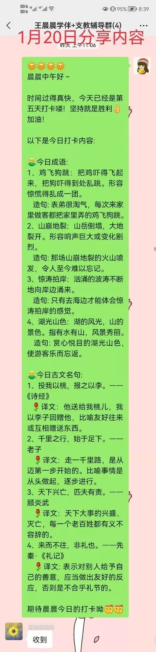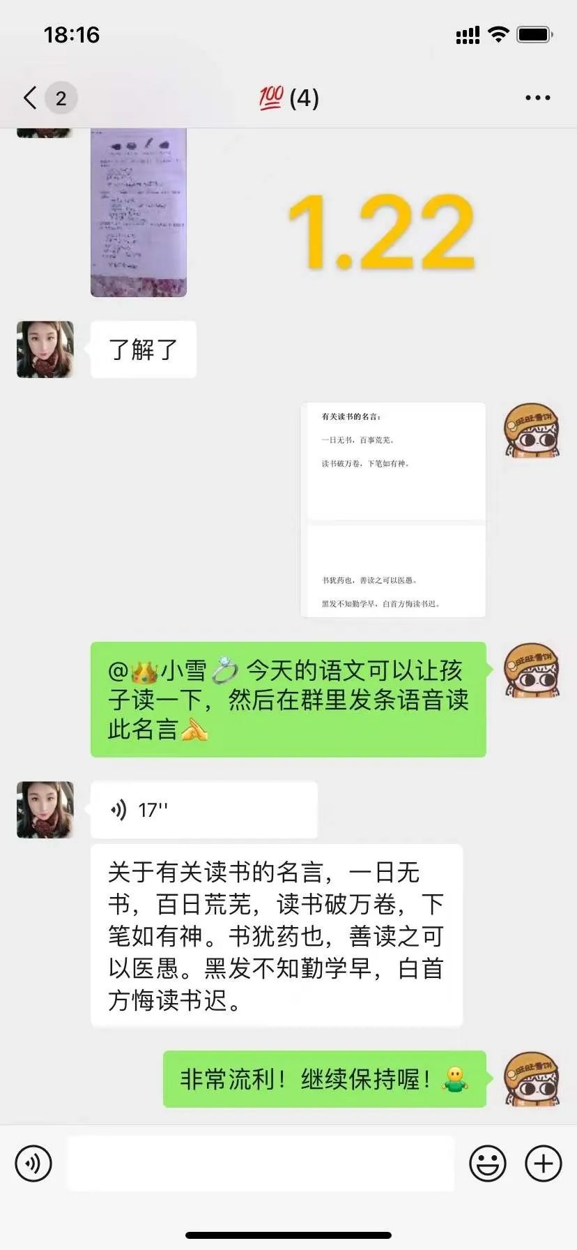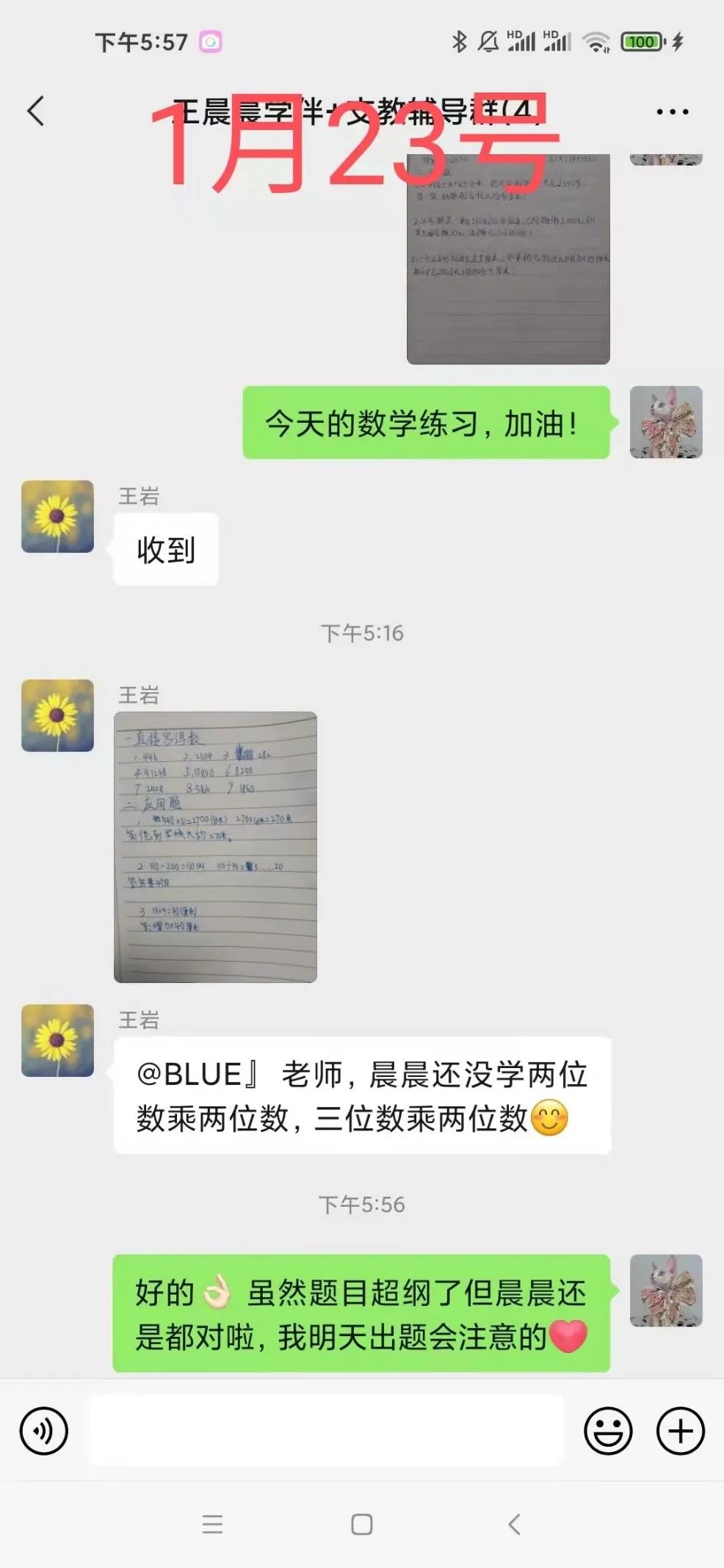 线上支教活动已经进行了一段时间,我们三位老师以及员工家长都已经适应了这种教学模式。晨晨妈妈十分配合我们的工作,晨晨学习也十分努力,虽然每位老师布置的学习任务并不重,但是三科任务加起来也并不轻松,而且晨晨还有寒假作业要完成,并且每天都会进行额外的读书任务,她一直在坚持,从未抱怨,每次的作业都认真完成。作为老师,我的第一个员工就如此认真努力,我也感到十分骄傲,假期已经过完一半,在为数不多的日子里,我们会继续和家长一起陪伴孩子学习,更加认真努力完成辅导任务。