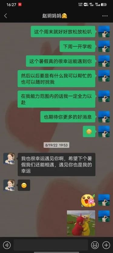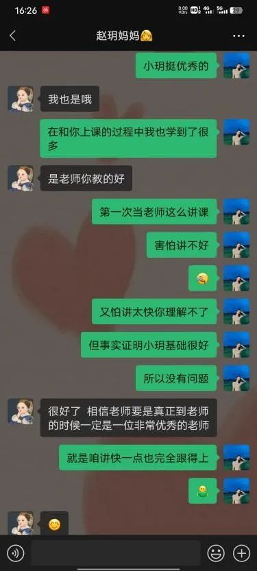 在整个上课过程中,我提出的每一个问题员工都会认真回答,也很配合我的教学。慢慢地,我对她的了解越来越多,我们也越来越熟悉。每次下课她都会礼貌地说老师再见,那一刻真的感觉好幸福。在暑假她也有加入课外培训班,最近还在准备单词比赛,每天都要求我给她讲50个单词,有很多都是超过她现在水平的,我能感受到她对知识的渴望,这也在一定程度上推动我去严格要求自己把课上好。果然老师是需要在教学过程中不断学习的,在这十几天里我的控场能力得到了很大提升,课堂上有突发情况也能灵活处理,语言表达能力更是上了一个台阶。我和她一起成长,一起成为更好的人,这大概就是教学相长吧。
